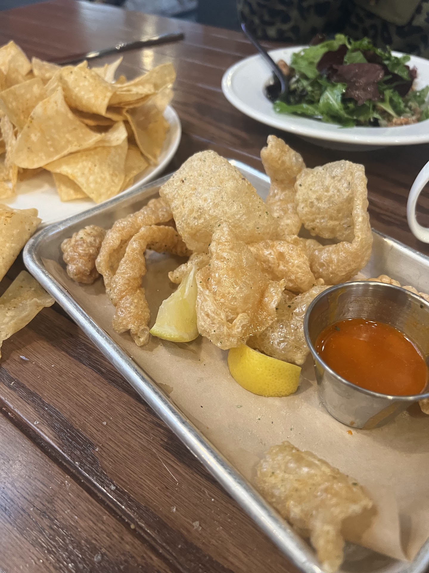 Read moreThis is a casual, hotel restaurant. When we arrived, we were seated by a fireplace, so the atmosphere was nice enough. However, the menu was very small, and we were never given a wine list or drink menu. This is odd, since this is a bar. The waiter was happy to bring us a merlot, but he never really offered to take a drink order?? We ordered chips and queso, and the bowl of queso was tiny! This was fine, since it was also very thin and flavorless. The pork chop I ordered was tough and chewy and I didn't finish it. My wife's salmon was cooked very well, but the spinach dish that came with it was pretty tasteless ... raw spinach and arugula, served with marinated tomatoes, which were not chopped up small enough, so the effect was just large, soggy, tomatoes when you bit into it. There were capers in the dish, but they were at the very bottom of the spinach. They would've been better, had they been piled on the salmon. Our meal was not worth the $100 + that it cost. The website states that they don't take reservations, and it is "first come first serve", which is laughable, since there would be no reason to make a reservation. It is apparent from the menu, that they strive to serve health conscious options for people who eat a certain way. This is great, but the food needs to then taste good. Parking...