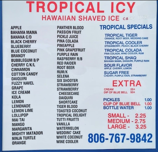 I consider myself a snow cone connoisseur. There is none better than Tropical Icy. My son-in-law is a fire fighter at the station near here. He told me this was the best in town. That was and understatementā¦ā¦ this is the best snow cone EVER! The ice is the finest youāll find anywhere. The flavors are deep and rich. My favorite is black cherry, but other family favorites are toasted marshmallow, banana, strawberry short cake, raspberry, and blue coconut. The added, donāt miss, special ingredient is CREAM! This is not normal cream. It seems to be mixture of marshmallow cream and sweetened condensed milk. Itās da bomb! We love this place and go as often as we can. Their hours are hit and miss, so we sometimes call ahead. The ladies working here are kind, helpful and enthusiastic. The price is right! This is a must do Lubbock thing! I highly recommend...