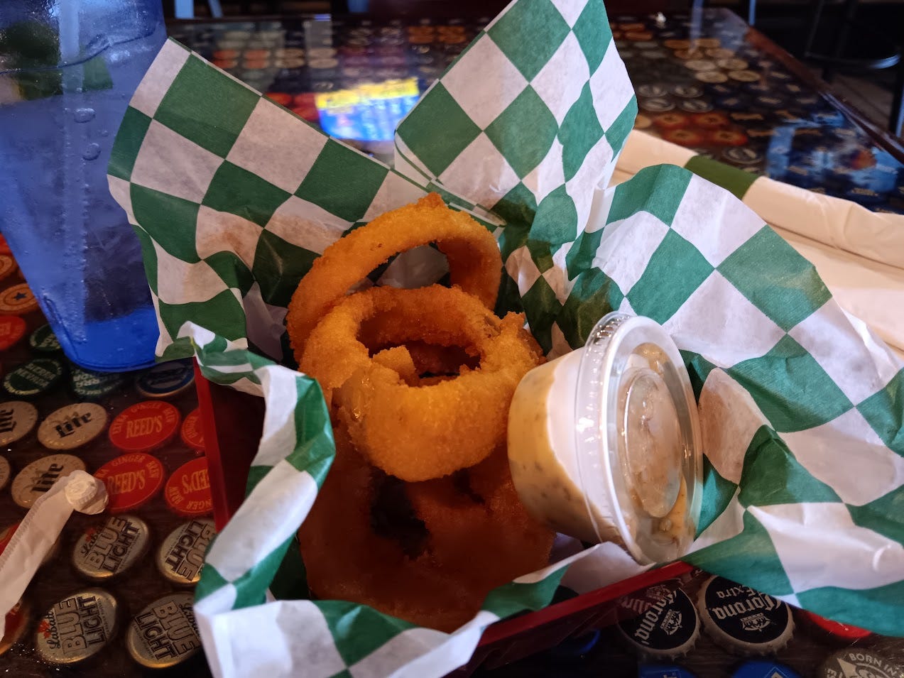 There are fewer surprises in the taste. They’re about exactly what you would expect from a sports bar on the shores of Lake Michigan: a greasy fried circle of onion and salt. The onion taste is mild, the batter slightly seasoned. They’re designed to be quick, hot, and forgotten.