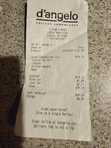 Read moreD'Angelo Ludlow Turn Pike.This place is amazing. It took me way back in time when D'Angelo was the place to get the best sandwiches ever. Thank you so so much Bonnie for always going above and beyond and making D'Angelo shine like it's supposed to be. You made my #9 steak and cheese pocket with lots of love and caring. I appreciate your kindness, your caring and your concern. I hope that D'Angelo values and appreciates the wonderful, caring, kind and loving person that you are and the value employee that you are. You definitely deserve my recognition and words can't express my sincere gratitude to you. Bonnie thank you so so much. Please continue to shine and continue to share your happiness and caring with customers like myself. May you and yours always be...