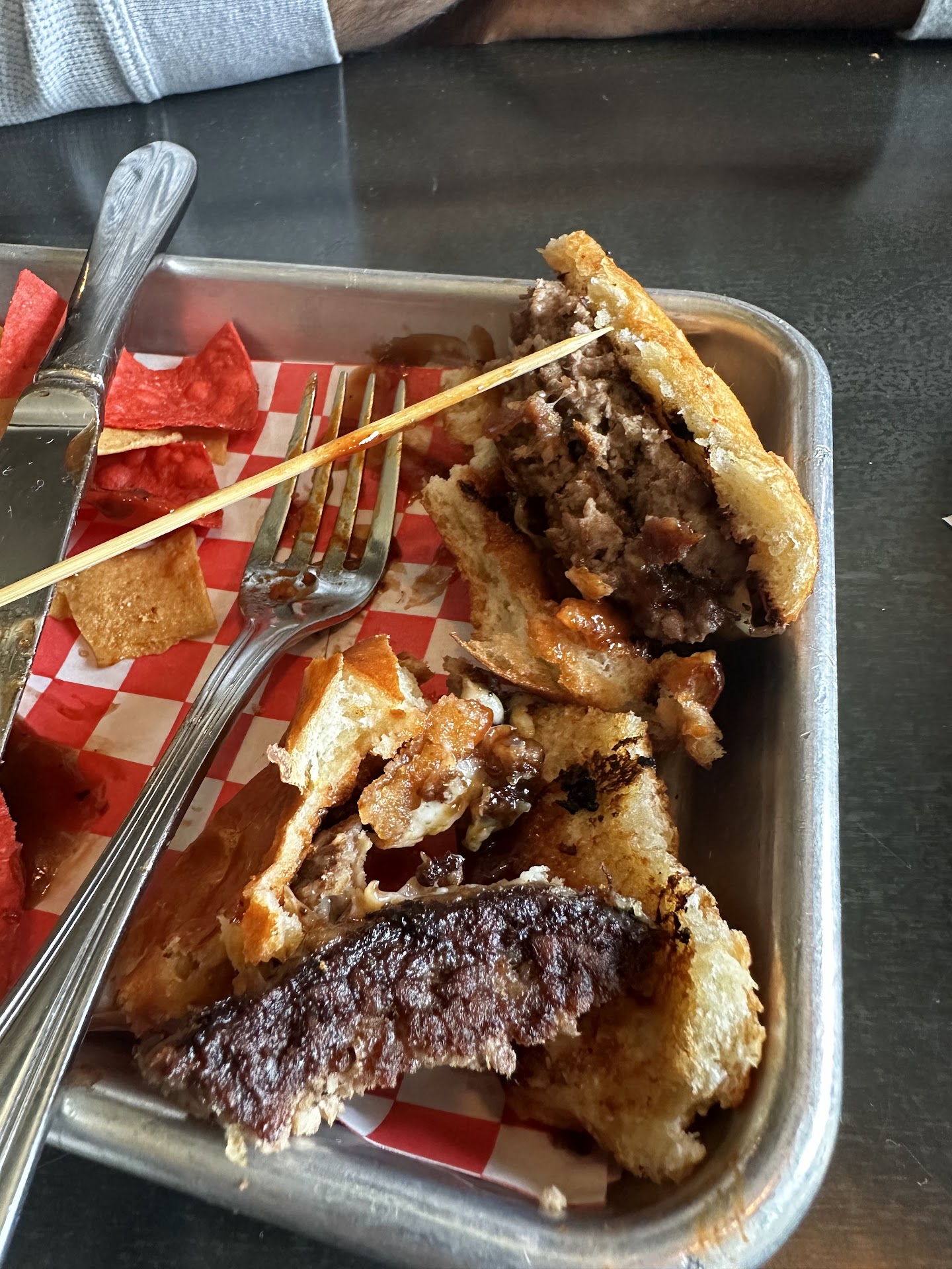 Secondly was the timing. Once he came over, we went ahead and ordered food since we weren’t sure we’d have another chance for a while. He took our orders, and within 3 minutes the first entree came out (before we even had waters at the table). The waters came out about 5 minutes later, and 2 of the next 5 entrees came out 10 minutes after that, 15 minutes after the first entree. Everyone at our table got our food at seemingly random times over the course of half an hour, and the fries all came out 7 minutes before the burgers. None of the timing made sense at all. Lastly, I ordered the chicken and waffle cone, which claimed “bone-in” fried chicken and fried pickles, and was more expensive than most of the other entrees (I assumed because of the bone-in fried chicken). What I got was a joke. 2 fried pickles among a moderately small portion of boneless chicken nuggets. The meat was dry, and they tasted like they came from a Tyson bag and were covered up by a syrupy glaze.