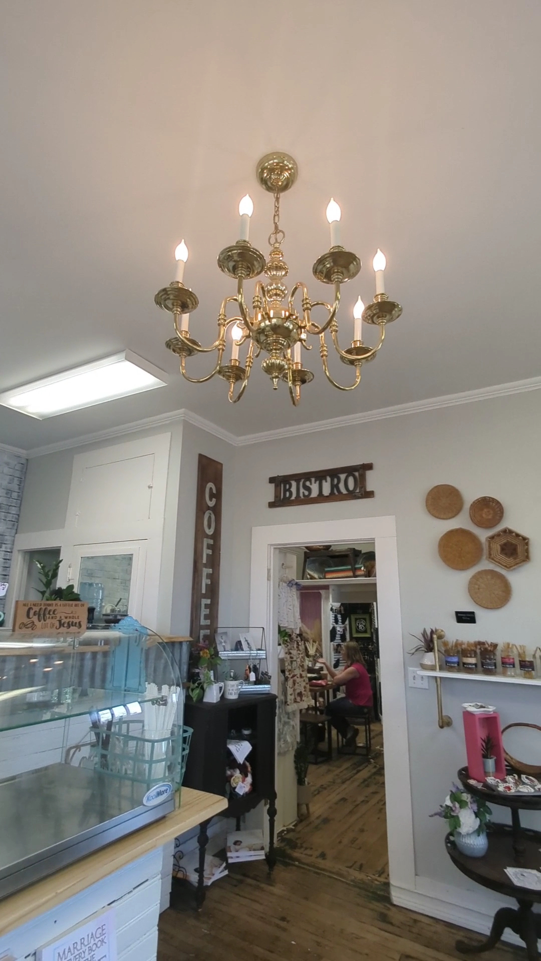 The first room has the counter and a small table and the second room has two tables and a sofa. The second room also is like a small boutique with lots of things for purchase seemingly from different vendors. The entire coffee shop is Christian based, although some of the vendors are just jewelry and clothes. But lots of Christian books, stickers, other inspirational items.