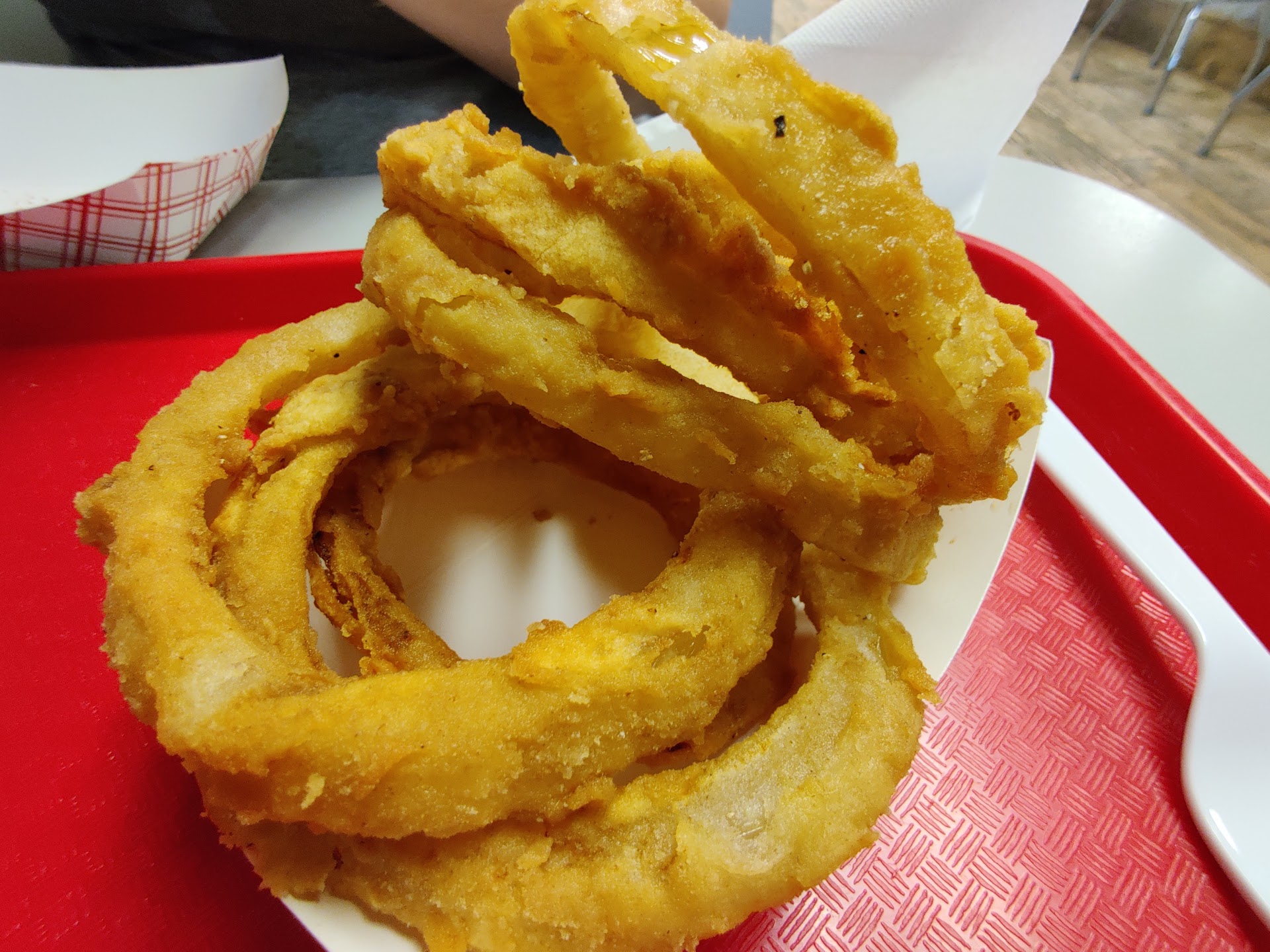 Read moreI've lived in Lufkin for 10 years and this was my first time eating at Ray's, and I'm very sorry I missed out all these years. We went on a Saturday evening and it was packed so I prepared for it to take a while to get service. Within seconds of being in line to order a guy came up with an " old timey" order pad, we placed our order, and a couple of minutes later was at the register to pay. While waiting on our food I had a chance to really check out the place. The red "leather" seats and booths make me think of what a 50's diner would've possibly looked like, and on the walls seemed to be a lot of motorcycle and car type of things (street signs, license plates, old pictures, etc), I did only view a small section. I loved the decor and it seemed very clean, which was surprising because of how busy they were. Also, they are still an actual "Drive-In" with numerous stalls that were hopping the whole time we were there which was cool. Our food was ready in probably 7 minutes tops. I ordered the jalapeno ranch burger and onion rings which was amazing! Messy, but the best burger I've ever eaten. The burger was huge. The only way I got close to finishing it was because I only able to eat a couple of onion rings, which were also delicious. My husband had the steak finger basket which he said was delicious. Our whole experience was wonderful, and we couldn't have received faster, friendlier service anywhere else in town. There's a reason they've been open this long. We will definitely be back and I highly recommend Ray's to anyone looking for (I guess) fast food type foods that are homemade with a...