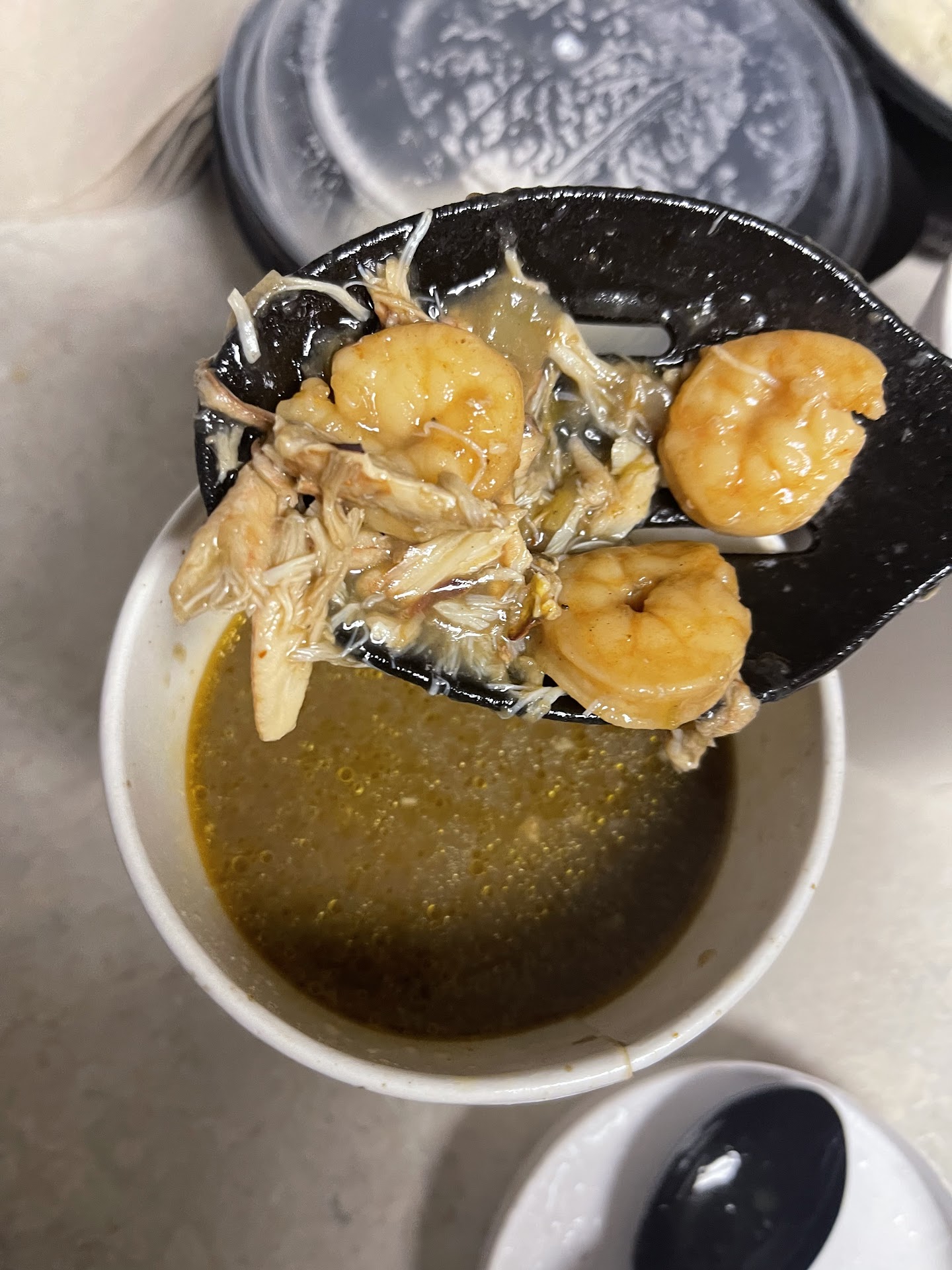 After I was finally able to order, the only seasoning options offered to me were three different versions of melted butter for dipping. There was no mention of having the seafood boil with any seasoning on the food itself. This was my first time ever experiencing a seafood boil that had absolutely NO seasoning on it. Sure, there was a small container of seasoning in the to go container, but that just doesn't do boiled seafood justice. Even though I was disappointed in the experience so far, I dove in head first to ensure I got the whole experience. I dumped that plastic container of spices into the bag of seafood and shook it up to coat everything in the bag. As expected, it didn't help much.