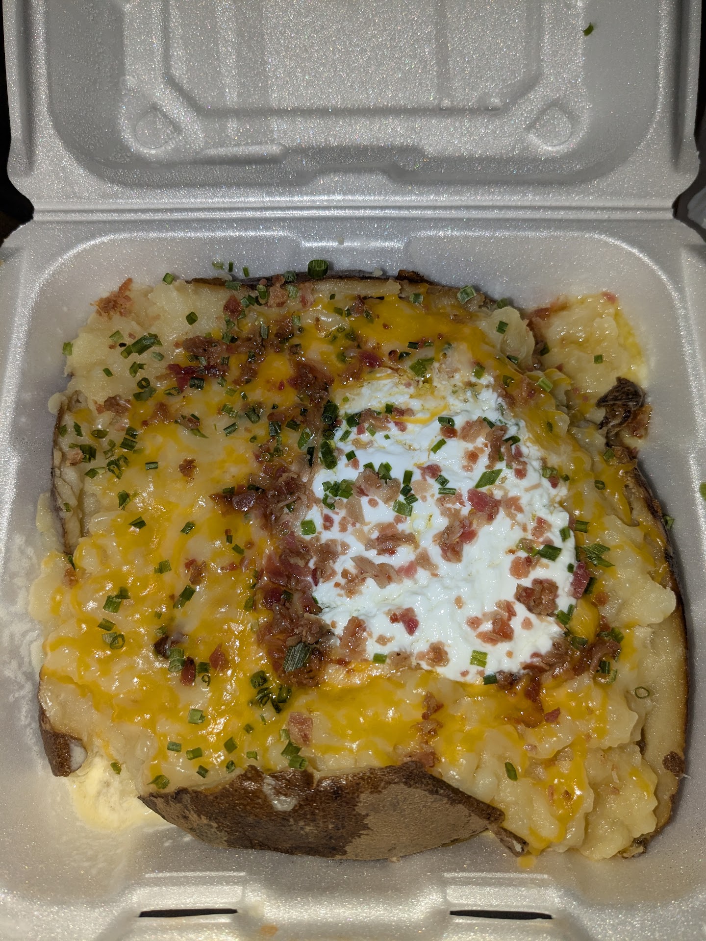 I ordered the #18 beef fajita cheese, sour cream & hot sauce baked potato. It was hot fluffy & fresh. Good size potato for the price. However, the ingredients were very much lacking. While it says all come with butter, I couldn't tell. Most basic potatoes come with chives or onion & bacon bits. These were extra. When I declined after knowing this, the nice young lady stated she would add them. The beef fajita meat seemed packaged or wasn't seared correctly because it was rubbery, & not seasoned. It was very reminiscent of the frozen fajita meat you get in the bag. The worst of it all was the VERY scant amount of meat it came with. Especially when it comes to meat potato ratio. You may order the Giant, which I guess is only the potato size because the portion of meat was that of a mini. I actually had to come home cook & add more meat. I ate 3servings out of this potato but had I not added add ingredients, day 2 would've only been potato & cheese. Overall, as is, size VS price was a way better deal than a...