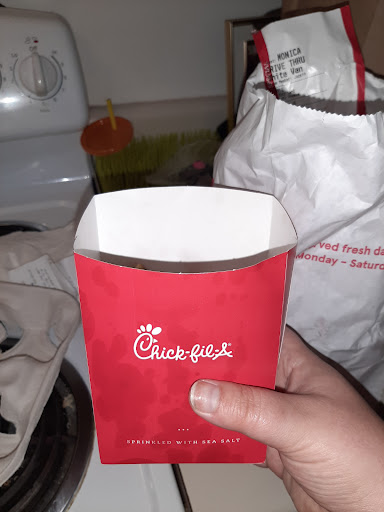 Read moreHadn't visited Chick-fil-A since my childhood and finally decided to go with my colleagues. I bought the spicy chicken sandwich meal with a sweet tea. After I paid, they handed me this ugly plastic cone for my order... When I got my food 5-7 minutes later, it didn't live up to the hype people claim. My sandwich did not have anything, except chicken, two thin pickle slices and the bread... The cashier didn't ask if I wanted anything on it and I assumed it came with everything and you tell them what to omit. He shouldn't have assumed that everyone knows their menu! The chicken meat was kind of dry and didn't seem flavorful. The waffles fries were great, always my favorite. Their employees are friendly, but that doesn't cut it for me. The facility was decently clean, not sparkling, but clean enough to dine-in. It was very full though, on this particular Wednesday around noon. The drive-thru had about 3 full lines operating and the dining room was full.
