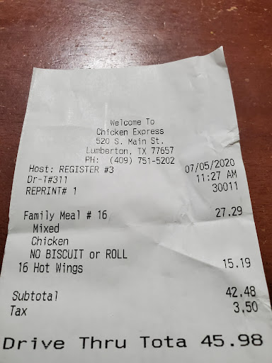 Ā Ā Ā Read moreOn Saturday, August 13th a group of us gathered & decided to order Chicken Express! Always a good choice! We had a huge order & unfortunately not all of it made it in our bags/possession. So once we got organized & realized we called & they said if we could just come back they'd correct it. Boy, let me tell ya...the manager on duty was an extremely professional š young man. He completely fixed our order & we learned a huge bus of kidos came in right behind us & a cook walked out on him. Even after all that frustration he remained calm, cool & collected. It's great to see young'n give a darn in this lost world. I wish him a bright future! Keep ur head up Dude you gonna make it!!! PS You already kno, I'll...