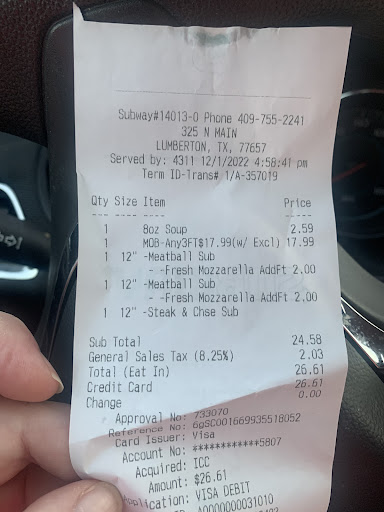 Read moreWe eat here all the time, the same order. I’ve never been charged for shredded mozzarella on my daughter’s meatball subs. The worker did NOT tell me that they only had whole mozzarella and did NOT tell me it costed $2 more per sandwich! I had a coupon for 3 foot long subs for $17.99 and I got a soup. It was a total of $26.61! When I told her I didn’t know about the cheese costing that she just laughed. I’m not eating there again. I feel like I got ripped off. And she put my soup in a huge subway bag and it...