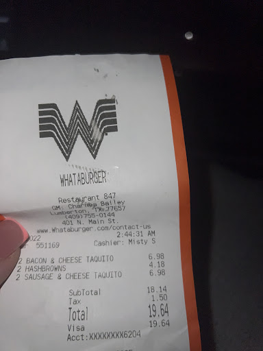 Ā Ā Ā Read moreI go to this Whataburger several times a month for the most part my food is made right.. But !! There are times like this visit where the person in the drive Thursday window was taking my order asked me to repeat my order 4 times literally, So after he said he had it, I asked for him to repeat it to me and he actually got the order correct... Now, when we get our food, it's just missing my veggies and mustard.. getting to order it was so messed up. Unfortunately, I went through Drive through and was in BeaumontTexas by the time we were starting to eat. I was having to go to Baptist Hospital, so I could not just go back...