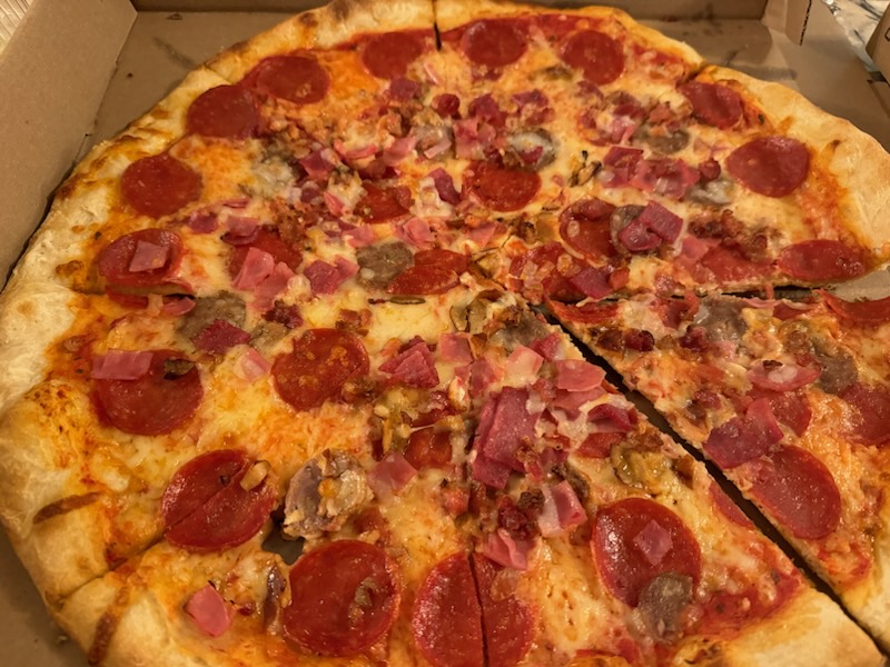 My partner really enjoys the veggie pizza. This pizza comes loaded with broccoli, peppers, onions, black olives, and tomato.