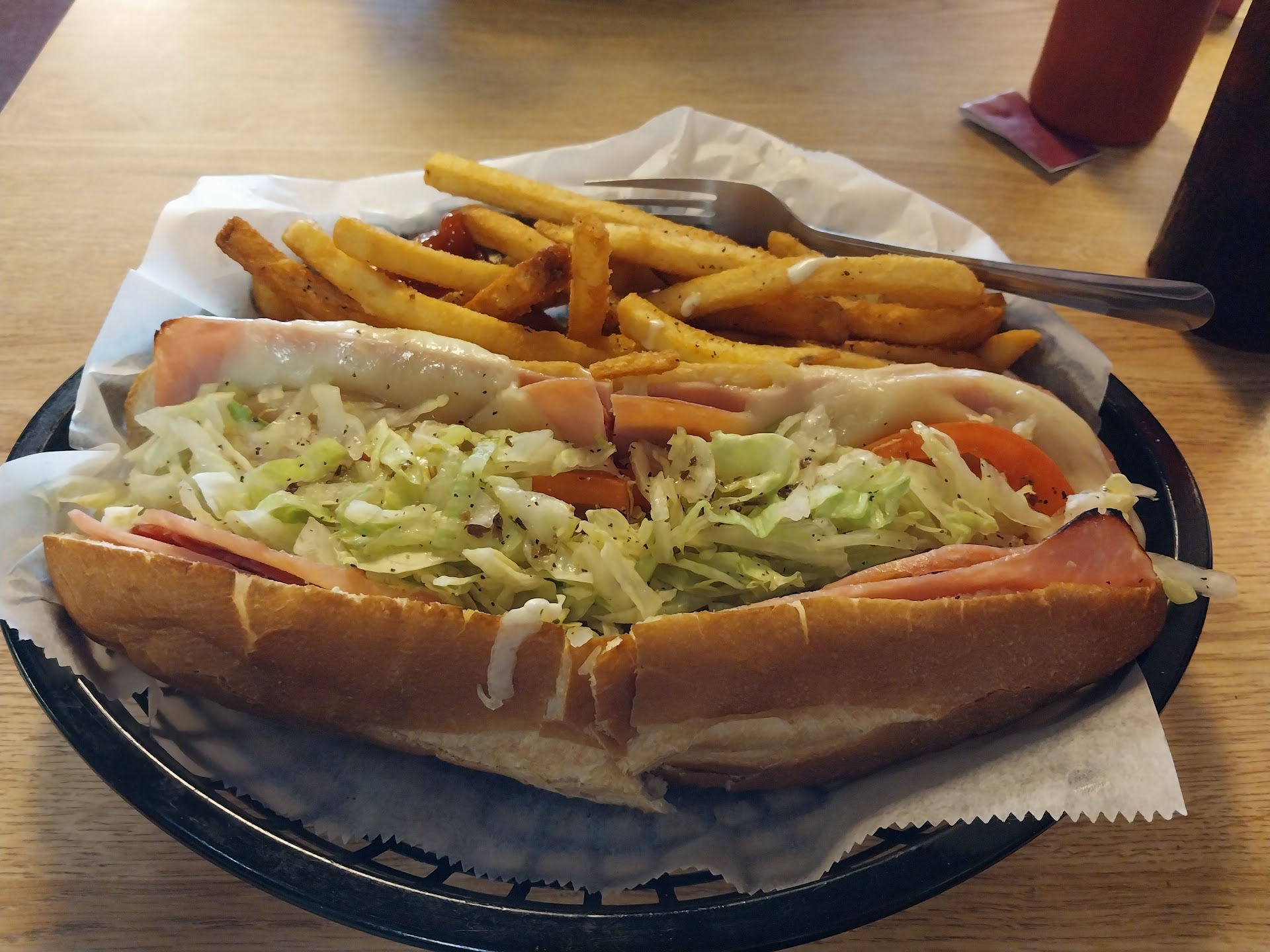 I will say that I am a sucker for a hot Italian sub, and this restaurant does not disappoint. I recommend it with lettuce, tomatoes, mayonnaise, vinegar and oil, and raw onions. This pairs really well with their delicious basket of fries that we usually share with the table.