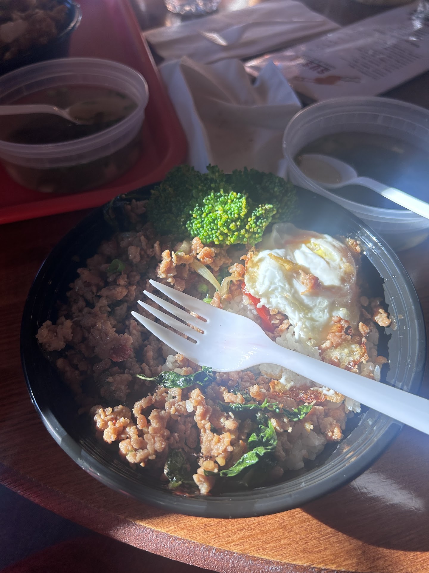Food portion was less as usual and was not good at all. Barely was any Basil flavor from the Basil fried rice. Charged us $3.30 for a Can of Soda !! Minute maid lemondae Can is $4 !! I didnât have courage to ask for other drinks.