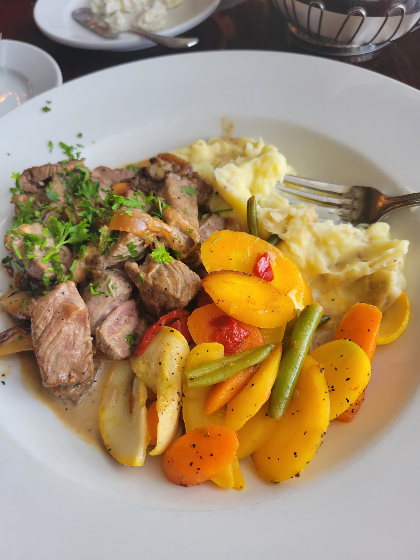 Ate here during my stay at the Mimslyn Hotel. The restaurant is very quaint right up my alley. Staff was incredibly nice and did a great job catering to their guests. I personally loved the beef tips -wish there were more mushrooms but the beef was good. And the French Onion soup was amazing hands down my favorite item! I also tried the Stuff portabella and I think it would have been great but it lack salt on the collards and the brie did not cover the mushroom looked like it slid off to one side so that side was amazing while the other was a little blan. But I'd try it again! Again staff amazing Rayanne, Patience, the hostess (sorry for your name) they were all fantastic. Currently they are not serving a full breakfast menu but offer guests complimentary quiche, fruit, packaged muffin, coffee and tea. *Also can appreciate that they wear masks - speaks volumes in understanding they may come in contact with non vaccinated or currently infected people and do their part to prevent the...