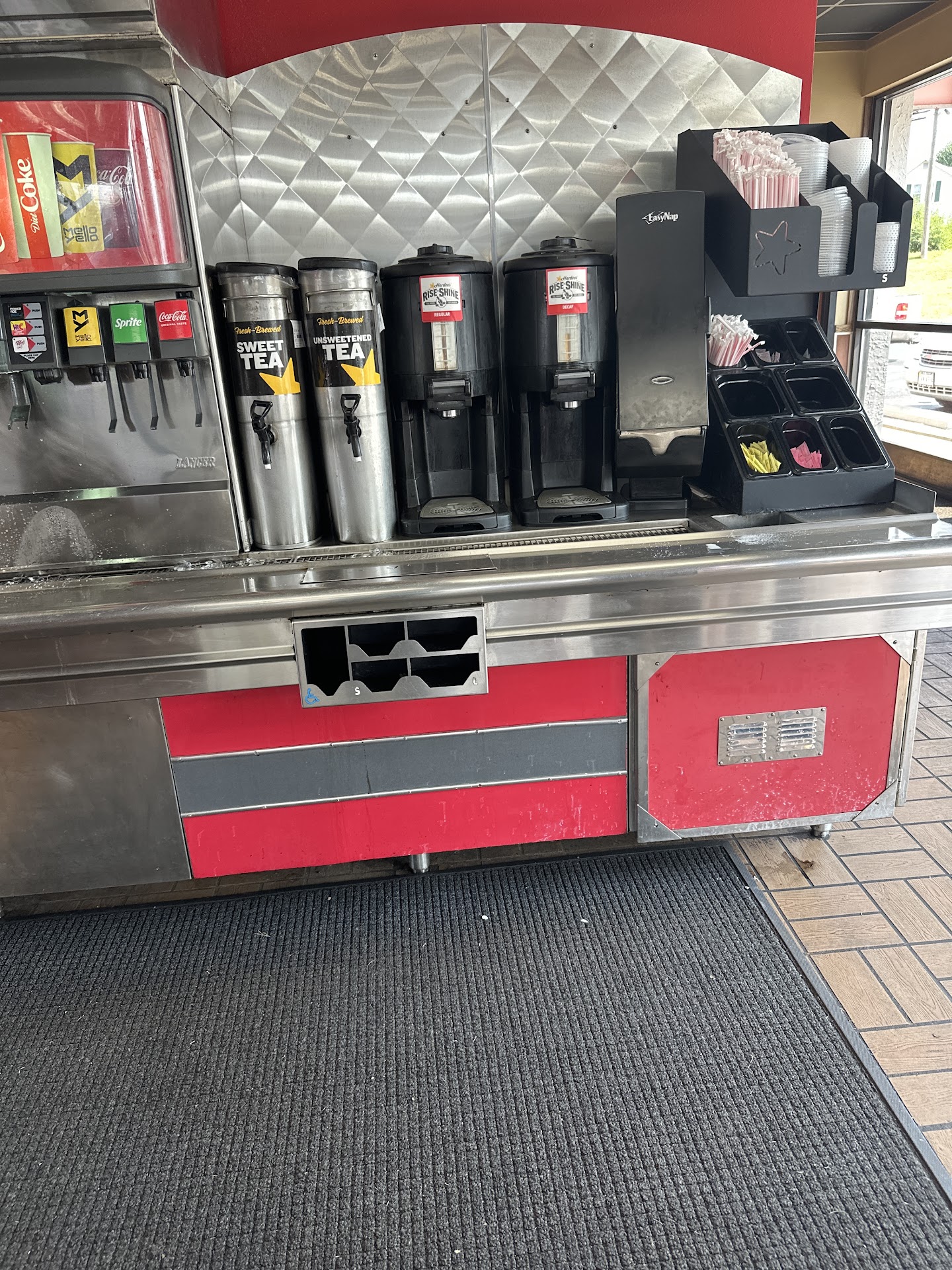 I wish I could give 0 stars. My husband and I stopped here for a quick bite to eat after visiting the Luray Caverns, big mistake! We both had to use the restroom first before ordering, women's was out of toilet paper in both stalls, and the men's had a stagnant water smell accompanied with a fly infestation and moldy sink area. This should've been our sign to leave, but we were both starving and hadn't had Hardee's in over a year because we didn't have any near us. We originally wanted to dine inside, but every single table was filthy; it was shortly after lunch time so we thought "maybe they had a rush and haven't had the chance to clean." Placed our order and went to grab our drinks to discover a nasty, moldy ice machine atop the drink station, and this is when we knew we had made a mistake. Once we got our food, we went out to the car to discover cold fries that had likely been sitting for 20+ minutes, soggy chicken tenders and a cold burger with a burnt-to-a-crisp bun. We were so disgusted after walking out of there that we barely ate two bites before opting to toss it because of a loss of appetite. Save your money and go elsewhere for food in Luray, literally...