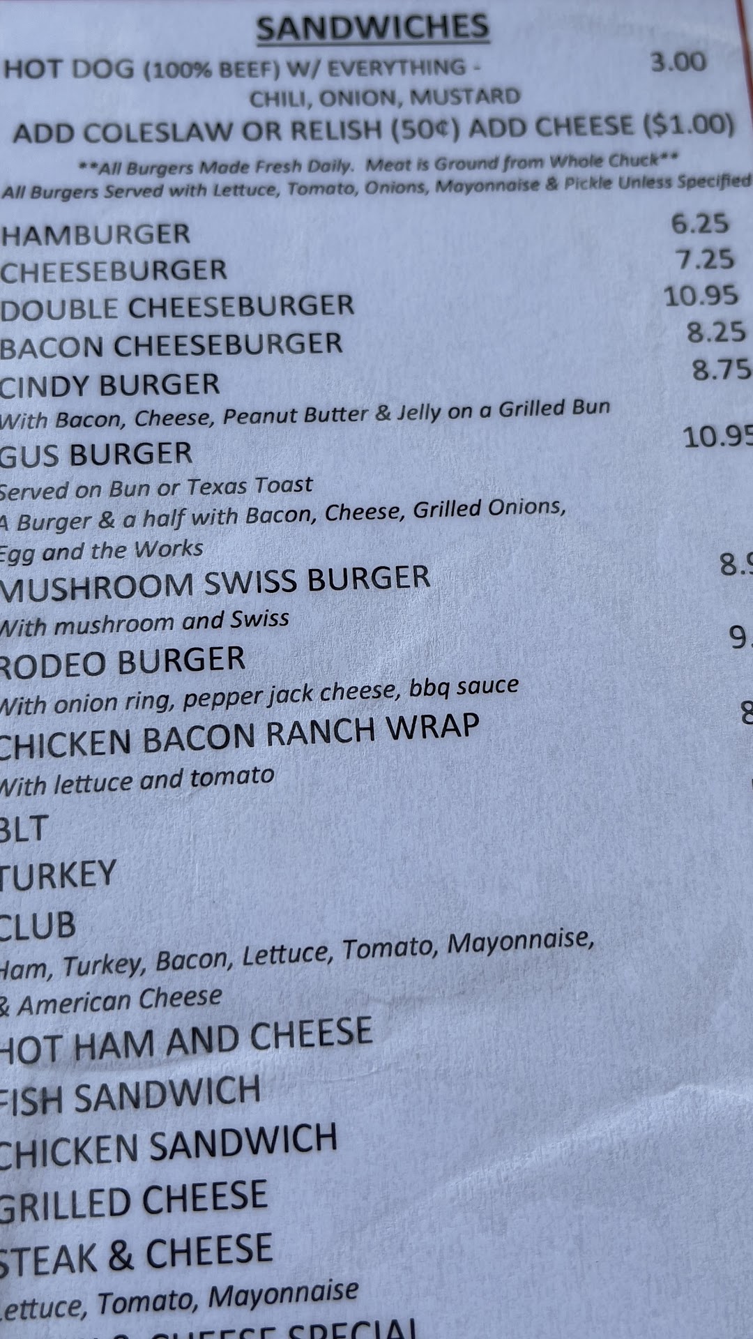 Food was bland. We ordered cheeseburgers asked for them to be cooked medium, they were well done, toppings were chintzy, e.g., one pickle slice on the whole burger, there was nothing special about the buns. Maybe toasting or steaming them would have added some interest. Steak and cheese sandwich toppings were only on one side of the hoagie roll. not evenly distributedânot that big of a deal. French fries were cooked in oil that was not hot enough, they were limp, soggy fries. We also ordered a peach ice cream shake, which was goodânot great, but good. Service: our order was taken promptly enough, however, it took a long time for our food to come out. Our food was warm, not hot, when it came. At no point during the meal we were asked if everything was satisfactory. Atmosphere: it was basic, which wouldnât have been as much of a big deal if the other elementsâfood and serviceâwere above average. The music was far too loud. I realize you canât please everyone with music choices, (modern country is not my first pick), but I can read the room and see to whom the music is being catered. Overall, it wasnât terrible, but I certainly wouldnât have driven four miles out of my way to go to a truly overrated restaurant. Maybe it was an off day for them. I felt like I was eating at someoneâs house I...