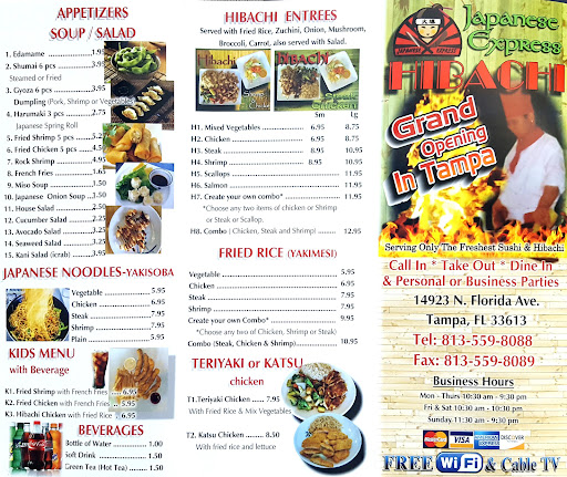 A wonderful addition to the Southeastern Lutz eateries! The Hibachi Japanese Express is a few months old now, and is an excellent place to eat. They serve a wide variety of fresh, tasty menu items cooked as you order in woks, not ladled out of hours-old bins. They specialize in Sushi Rolls (35 different types) and have a bar with a Sushi Chef!