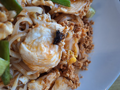My wife and I went to the Thai Cafe about two months ago, and we had the Pad Thai and it was excellent. It was on a Saturday evening, the waitress was so nice, and the food and atmosphere was great. Much better than the previous owner. So we thought, great, we won't have to travel to Tampa to get great Thai food. Well, we decided to stop by again on a Wednesday evening. It was completely different. There were two women from the children's Gym next door, and they were talking so loudly you couldn't hear the music playing in the background. They were talking about the other parents and how they were idiots and making other very derogatory comments. They weren't eating any food, just drinking lemon water, and the manner in which they were acting, you could tell this was a regular place to hang out for them. I asked the waitress if we could move our table a little further away, and she did. Her name was Apple. A few minutes later, 5 children from the Gym came in, and began to run around the table, laughing and playing. They sat down after the other two ladies said something to them, and they began playing on a mobile game console and laughing and playing, at the table next to us. Now understand, I have no issue with kids playing and laughing, but inside of a restaurant, when you are trying to eat, and have a moment of peace and quiet to enjoy your dinner, is not the place. I did now want to cause any issue, so I just kept my mouth shut. There were only two other people in the restaurant. Another lady waiting to be served like we were and a person waiting to pick up an order. There was so much noise that the other lady finally just got up from her table and left, without getting her food. She had had enough. We were almost at that point, when Apple brought our food to the table. I had ordered the Amazing Duck, and my wife ordered something with chicken in it. I am so glad that we took the time to talk about the food before we began eating, and my wife just started to put a piece of chicken in her mouth when she let out a little scream. I don't know what kind of insect or bug it is, but you can clearly see it in the picture. This is either a palmetto bug, or a large wasp, but it was under the first piece of chicken that my wife picked up to eat. I called Apple over and showed it to her, and said I want to talk to your cook. She apologized, and took it out to show to the cook, and she came back out and asked if we could wait another 15 minutes for them to recook the order. I looked at her and said, "why cant the cook bother to at least come out here and apologize for making this crap"? And she said, they were too busy to come out. So, I stood up, took my wife by the hand and walked out. I understand that when you are busy, you can make a mistake, but we were the only order he was preparing. NO ONE else was ordering any food! Now you take a look at the size of that insect and tell me, how could you possibly miss that when you are cooking someone's food. And then on top of that, you can't be bothered to come out and apologize for your actions. I know that they will never get a second chance to cook anything for me or my wife, and if you have read this far, then I would suggest you find another place for...