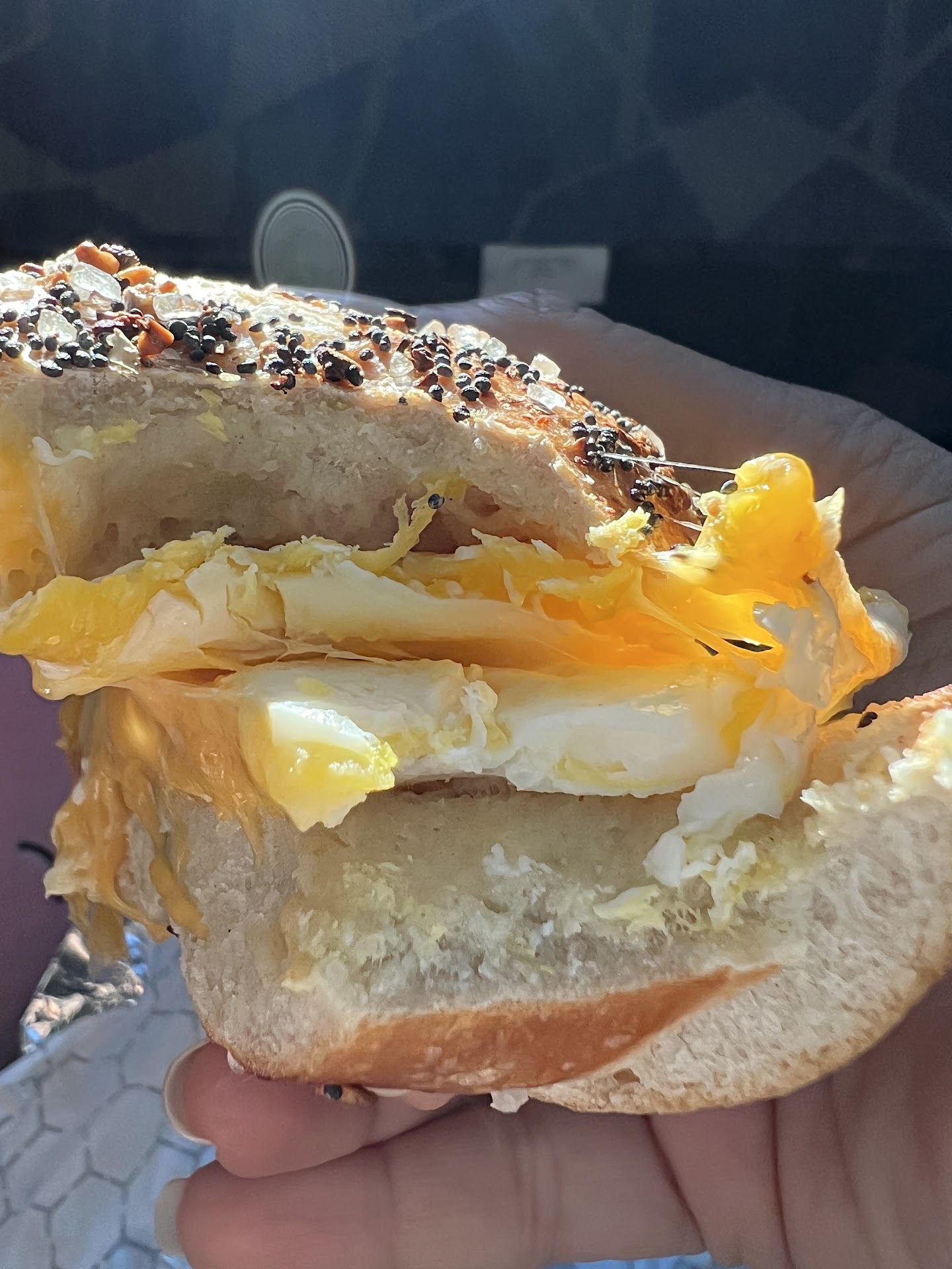 This time we had the Plane Jane (2 fried eggs, cheddar cheese in an everything bagel). It was absolutely delicious!!!! Perfect amount of salt and seasoning on the bagel itself and the eggs and cheese married beautifully with the bagel!