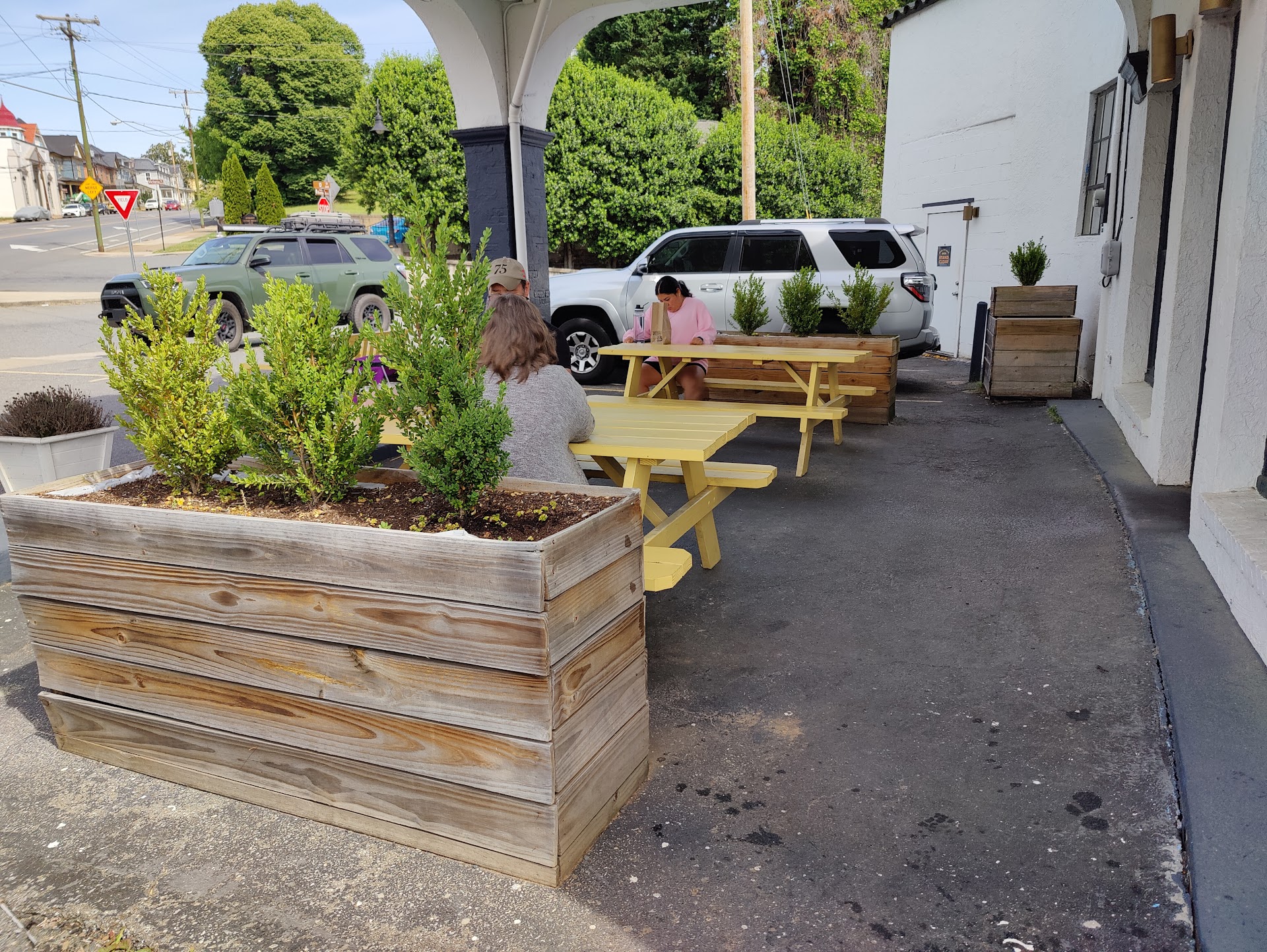Read moreI was meeting some relatives in this lovely town and the place we had selected was not having outdoor dining due to patio repairs. It was a Monday and our places were limited. We were told by employees of a coffee house to come here. Said they had picnic tables outside and both parties were with pooches. We pull up and the parking lot is TINY and a group of young people at the picnic tables. Turns out they were waiting to order. It's a small place with no indoor seating. It was packed. My relative ordered for me and got me the Bee Sting bagel. It was quite tasty although it needed a tad more seasoning. I got two plain bagels to take home....salt and jalapeno cheddar. The nice lady at register said all bagels were made at another location and brought to this location. All spreads made in house too. Don't miss the view off the backside/side. I had no idea Lynchburg was so hilly! Oh yeah, if you are lucky you may get to meet Doc the wonderdog! A golden lab who is so friendly and apparently a...