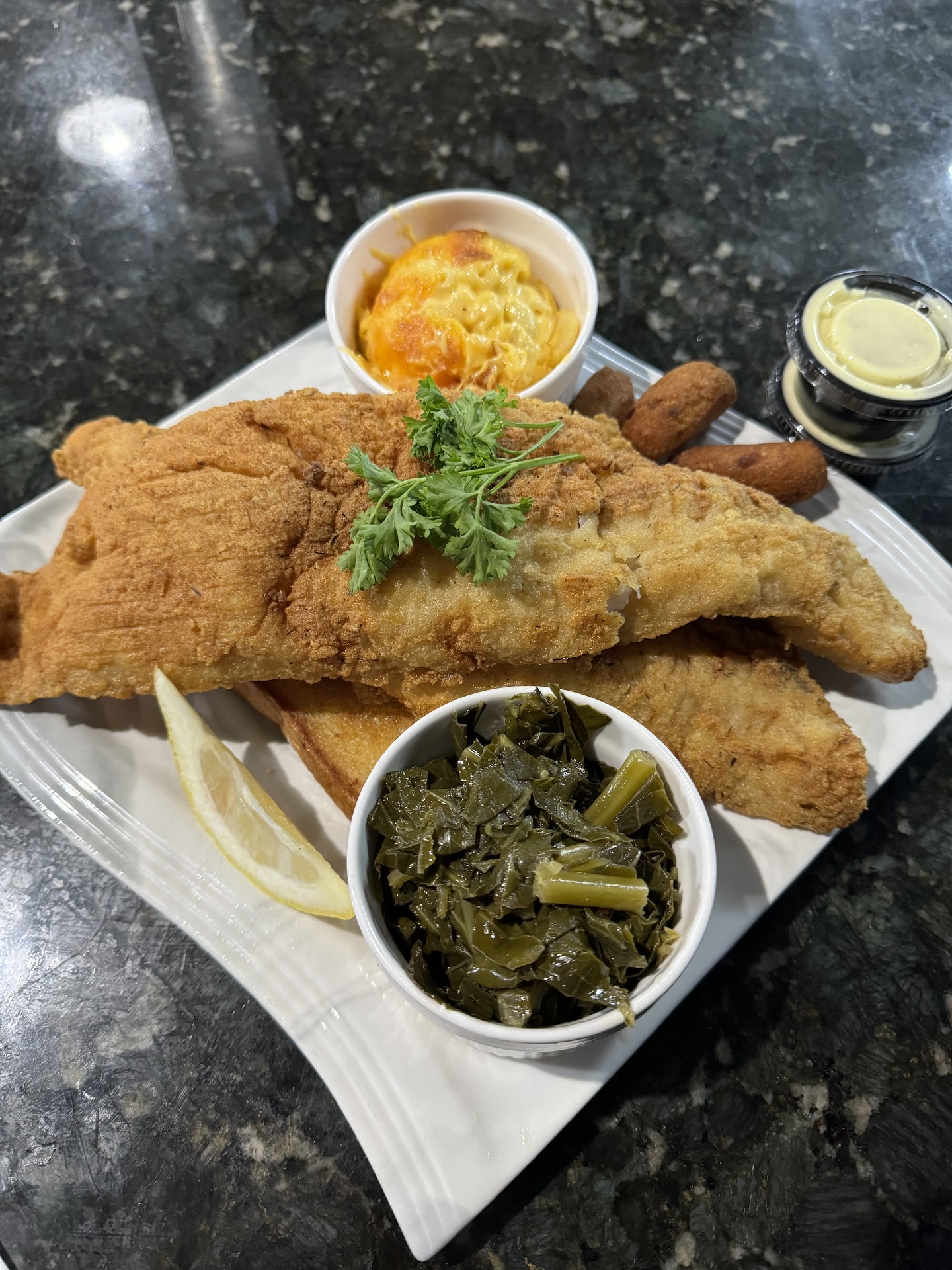 My lamb chops were really good and seasoned well. The Mac and cheese was reported to be "to die for" but I don't see that. It is decent restaurant level Mac and cheese but I grew up on homemade Mac and cheese. Collards were well seasoned. My Mom's fish and chips were really good. The fish was fresh out of the fryer. Good flavor. My sister said her meatloaf was good as well. She agreed on the Mac.....not to die for but decent for a southern restaurant.