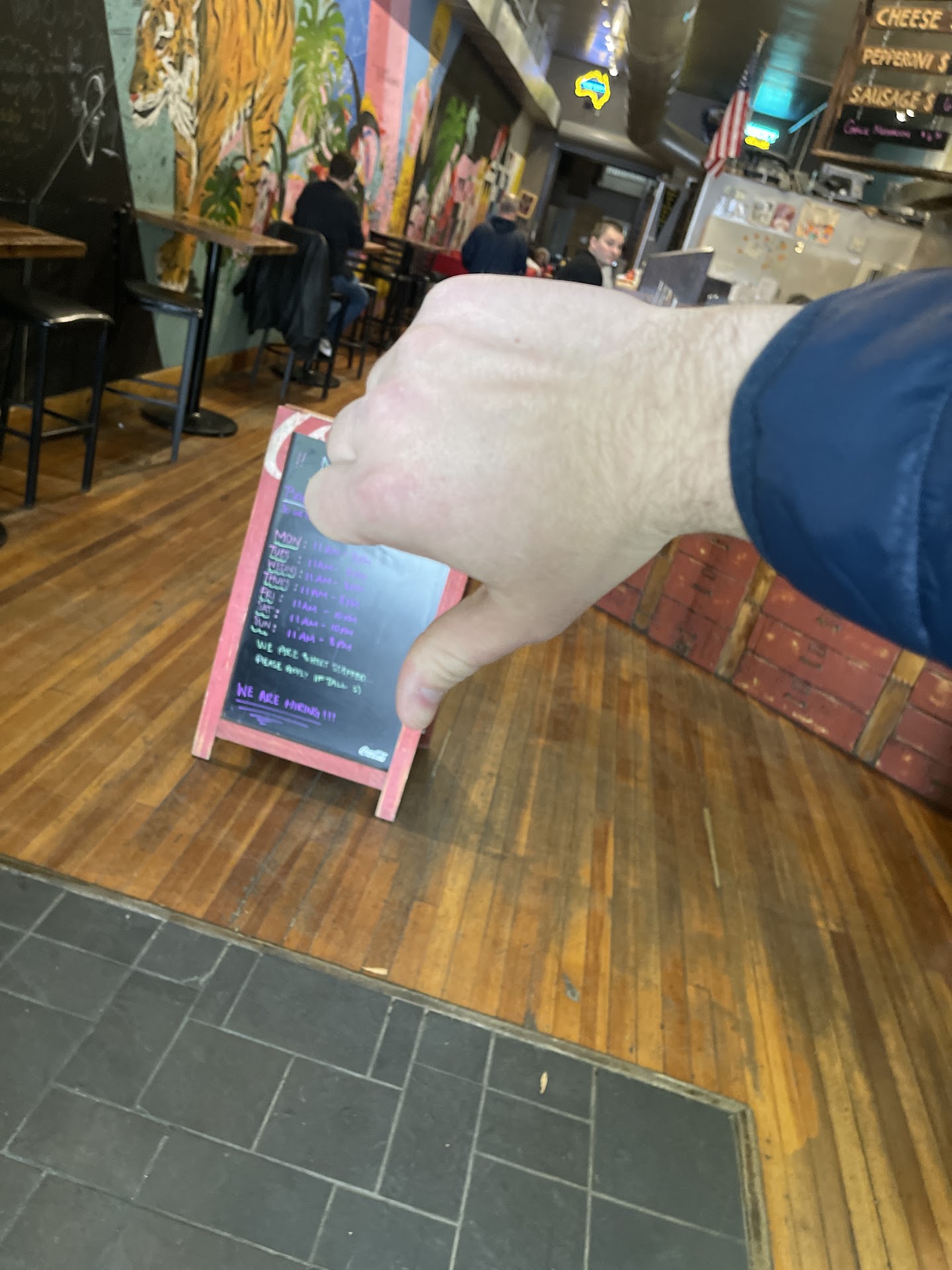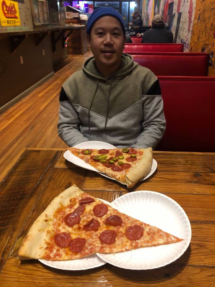 Read moreStopped in today (12-1-2019)for lunch with my daughter. Road in front is currently under construction but there is a convenient parking deck just across the street. A colorful and interesting facility. Eclectic decor .It looks like it was once an old apartment building, with a grand staircase in the back. You can sign you your name and draw on the wall if you like. There is a real, hugh honest to goodness, genuine,old fashioned functional pinball machine in the back. Brought back a lot of memories to play it! I'd go back just for the pinball. We had pizza, and the slices are as big as your head! It comes from a 28 inch pizza!They were promptly served piping hot.Very tasty! Reasonable price for what you get. There is a prize if you can eat an entire pizza yourself in less than 60 minutes. Only a few have accomplished this feat! The restrooms are clean and festooned with old comic strips wallpaper above steel plating. I definitely recommend and look forward...