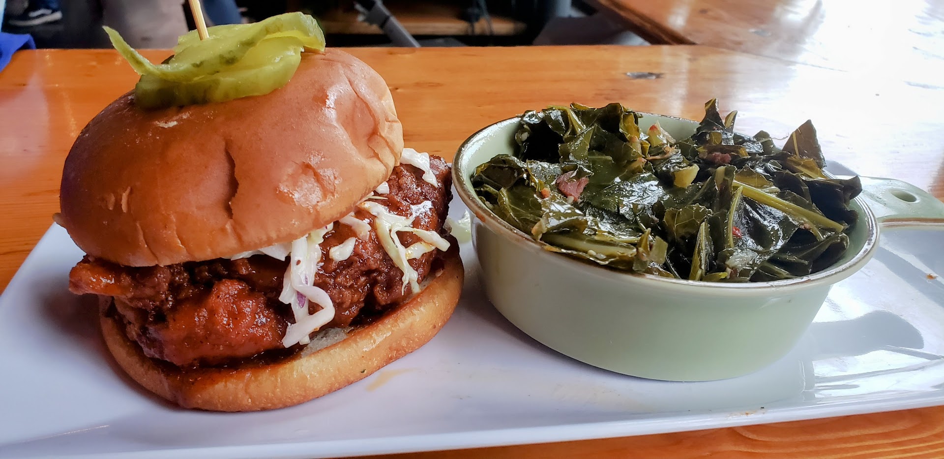 it was exactly what I expected. I checked in with the waitress to ensure the recipe hadn't been changed and to her knowledge, it had not. I think the thing that people might be missing is that Nashville hot chicken IS supposed to be spicier than non-Nashville hot chicken. The whole premise behind it is lots of cayenne/spice in the breading and then an added hot sauce on top of that. So for those of you who like the level of spice the dish traditionally brings, it's delicious. No bitter flavor and nothing unmanageable spicy. Don't let those review keep you from visiting and trying it out! Also love their fruit teas though I ask that it be made with unsweet tea because otherwise it's too saccharine for my taste. Hopefully one day I'll have room at the end of the meal so I can fit in some...