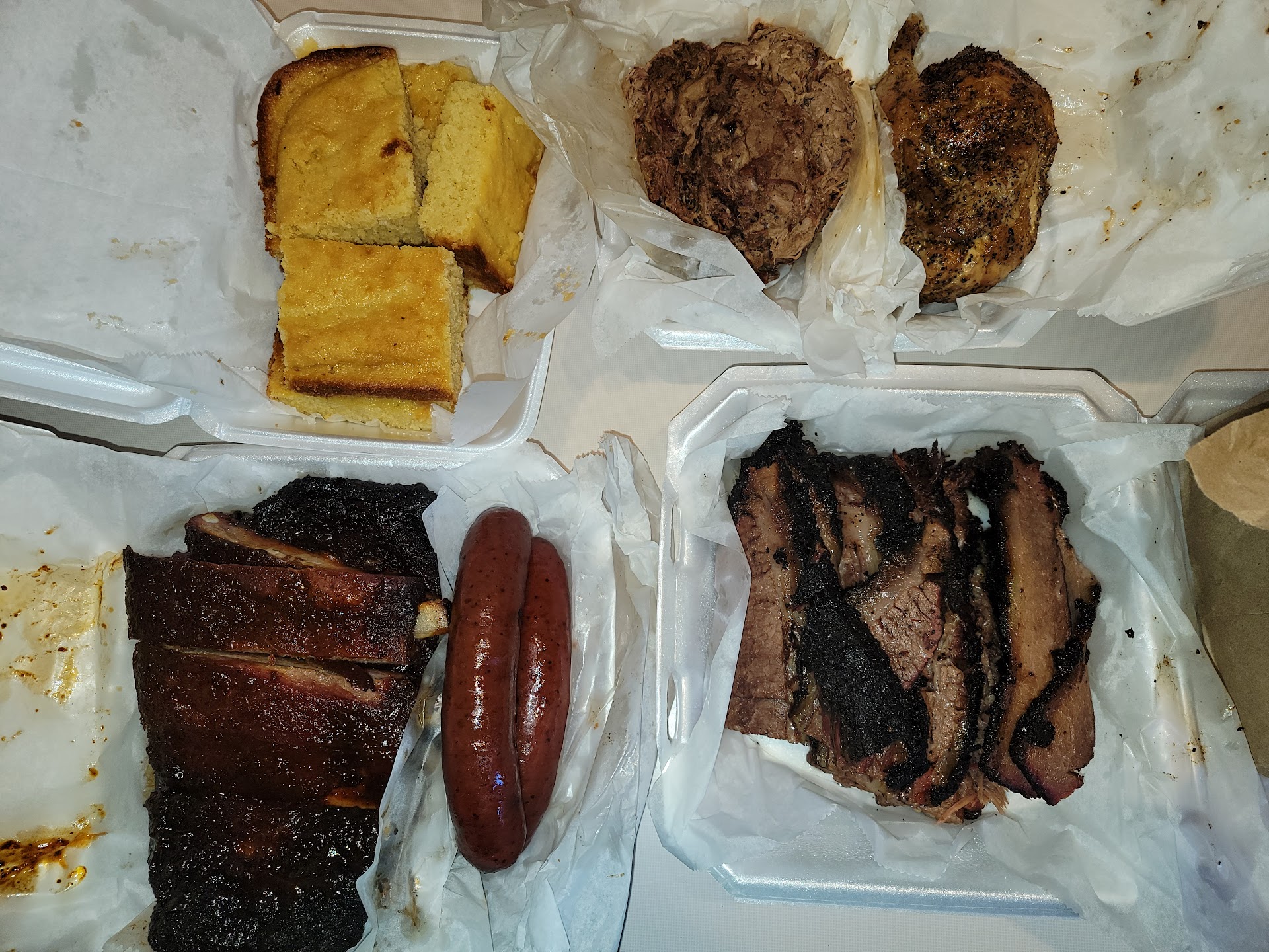 When I'm on the road I'm always on the lookout for good BBQ. This did not disappoint. Meat ranking by smoke 1-5: Brisket (5) some of the best I've had both wet and dry, heavily smoked and a perfect bark. Pulled Pork (5) it is extremely hard to find moist pulled pork without a sauce, this needs no sauce, and it is moist. Smoked Chicken (4) very good job on the chicken, I love the black pepper style when it comes to chicken and this ranks in the top 3 that I've had. Ribs (2) the flavor was very good but....I expected a smoke akin to the brisket, these did not have any smoke flavor, not even a hint and they were a bit dry. Ironically the ribs are basted with a BBQ sauce on top, but we all needed to use additional BBQ sauce and lots of it. Sides in order: Cornbread (5++) ohh lord if this would not spoil somehow on the way back to Florida I'd take a sheet of it back home, soft, buttery, sweet, no non processed cornmeal bits, just perfection. Smoked Sausage (5) very very good smoked sausage, don't know if it's homemade but it's very good, a must try. Collard Greens (5) a must try, smoky, salty goodness. Potato Salad (5) here's the thing, I have never had potato salad like this, I don't know what they did here but I don't like it, I love it!! Again if this could make it back to Florida, I'm taking the largest size they can offer. Mac n Cheese (2) great flavor, lots of creamy cheese, but thickens in your mouth like Velvetta which im no fan of in Mac n Cheese. Will you finish what's on your plate...yes, would you go back for second helping or order again as your main side...I'm iffy on that. Baked Beans (1) I just don't get it, and I think this may be a bad batch, their was a burnt or dirty smoke flavor to the beans, they do have brisket in them, that's a plus but I could not get past the burnt flavor. Lastly, the pickles.......an absolute 5 as a finisher or compliment to any of the meat or on a sandwich, loved it. Bottom line, yes this is a MUST visit!! FYI....you can sample any of what your ordering before going all in, and it's a great option, not offered at many places, I can only think of two other places I've visited that...