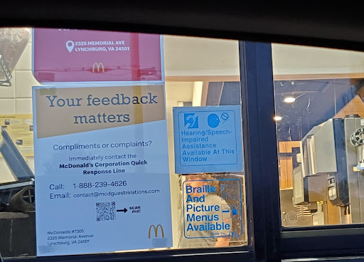 Read moreThe food was good.The only issue was a server that was working the register last Friday that was really disrespectful.Had to report her to the manager. I went to get my soft drink and by the time I returned to the counter someone had taken the coffee I ordered along with my meal. When I mentioned it to her,her reply was I shouldn't have left the counter and then she began over talking me and putting her hand up and saying she didn't want to hear what I was saying and telling me to leave. And she did this in front of other patrons. This was very embarrassing and insulting. I had planned on not ever going back, but I get my breakfast there sometimes before I myself go to work.Anyway, this is the McDonald's on Memorial Ave.in Lynchburg,Va. Please correct the way that certain employee's treat people when they choose to dine there. I don't know the lady's name that was working that day,but I can get her name the next time I see her there.Thank you for your service and concern. Have...