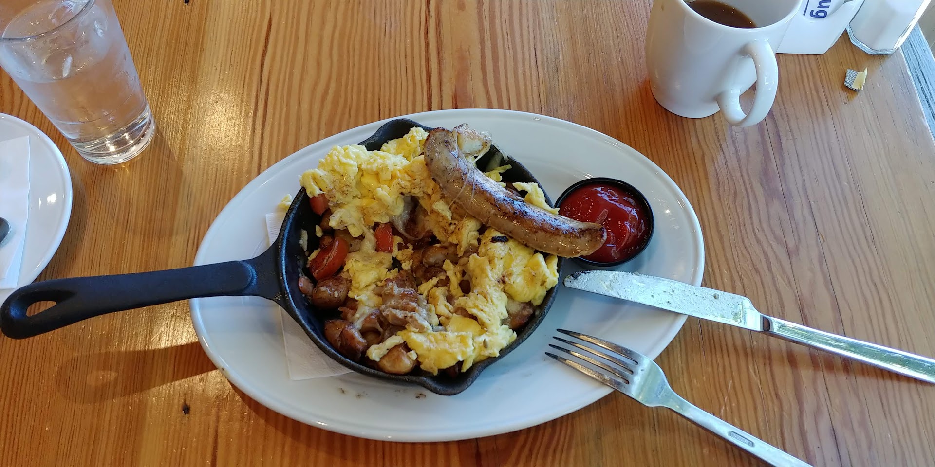 So you are not coming here for the ambiance and decor, or maybe you are? Lets talk about the food: The food was awesome! I had the Duke's Sausage Skillet which was eggs (cooked how you want them), over a bed of perfectly seasoned and cooked potatoes, with chunks of tomato, decide onions and garlic, topped with chicken sausage. I swear, i haven't tasted anything so well put together, and I've tasted a lot of things in my life. My boyfriend had the Eggs benedict and that was also smashingly good, some of the best benedict sauce in a very long time, not to heavy on the lemon, and just a touch of cayenne pepper (?). Lets just suffice to say that whomever the executive chef is, they have an awesome menu, with great tasting food. If I've ever back in Lynchburg, this is where I'm...