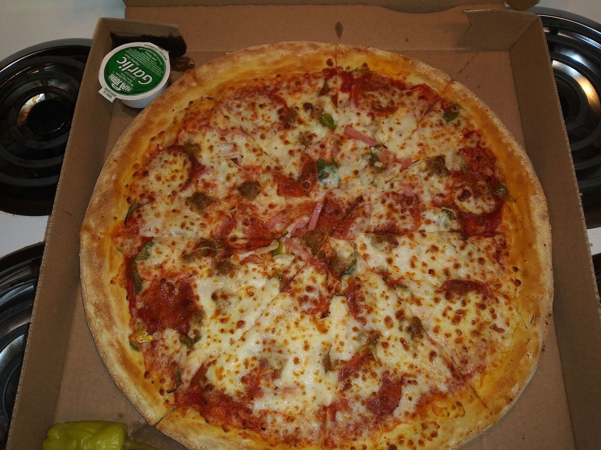 Placed an order online for carryout tonight for two larges with their new garlic parmesan crust, an order of chicken poppers, and buffalo wings.