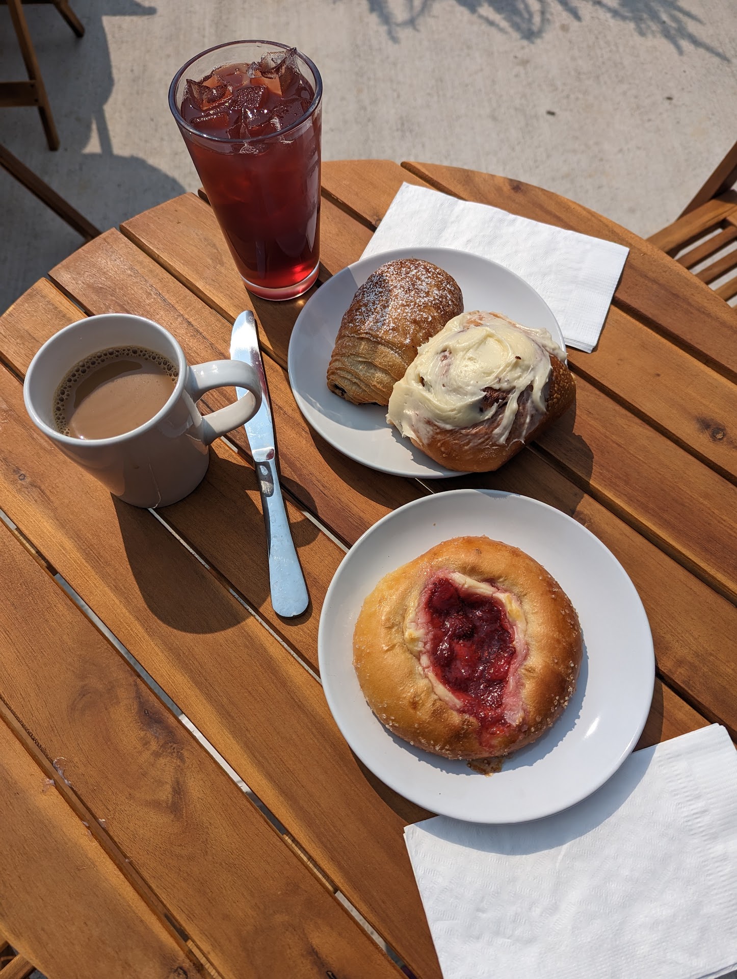 Kolache = 4.50-5.00 (can't remember!) Cinnamon Roll = 5.00 Chocolate Croissant = 4.75 Cup of Self-serve drip coffee =...