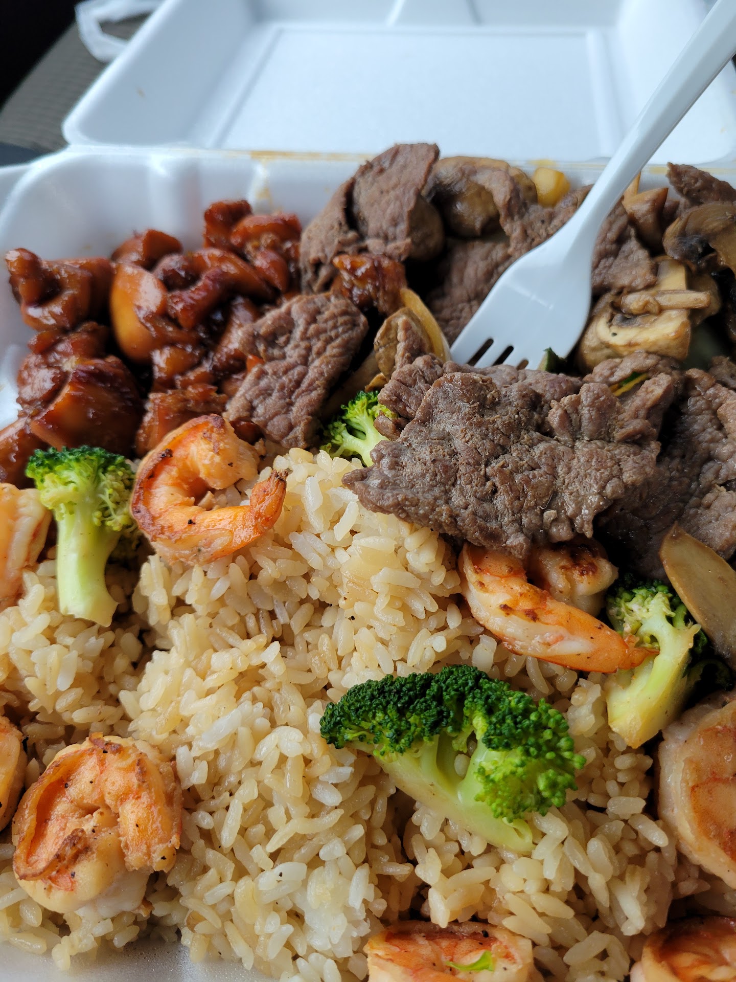Overall, the hibachi was overcooked, bland, and underwhelming. Chicken tasted off. Steak was rubbery. Shrimp was ok at least. The vegetables were well seasoned, probably the only thing I liked. The fried rice was also kind of bland. Just not impressed.