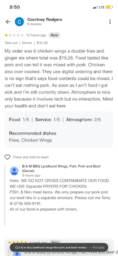 Reply to Terry's response. I called and there was no answer. Separate fryers and smokers does not stop cross contamination. There is a HUMAN in the process making decisions. Cross contamination can occur when someone uses utensils, towels to wipe utensils, gloves, or splatters food in other food, etc. The tase of pork was in my food and clearly someone needs a lesson in customer service and food preperation. Also, even though you claim the food is prepared with timers, were the timers and heat settings set correctly? Timers mean nothing if the food is not cooked at the correct temperature. That's how food poisoning can occur.