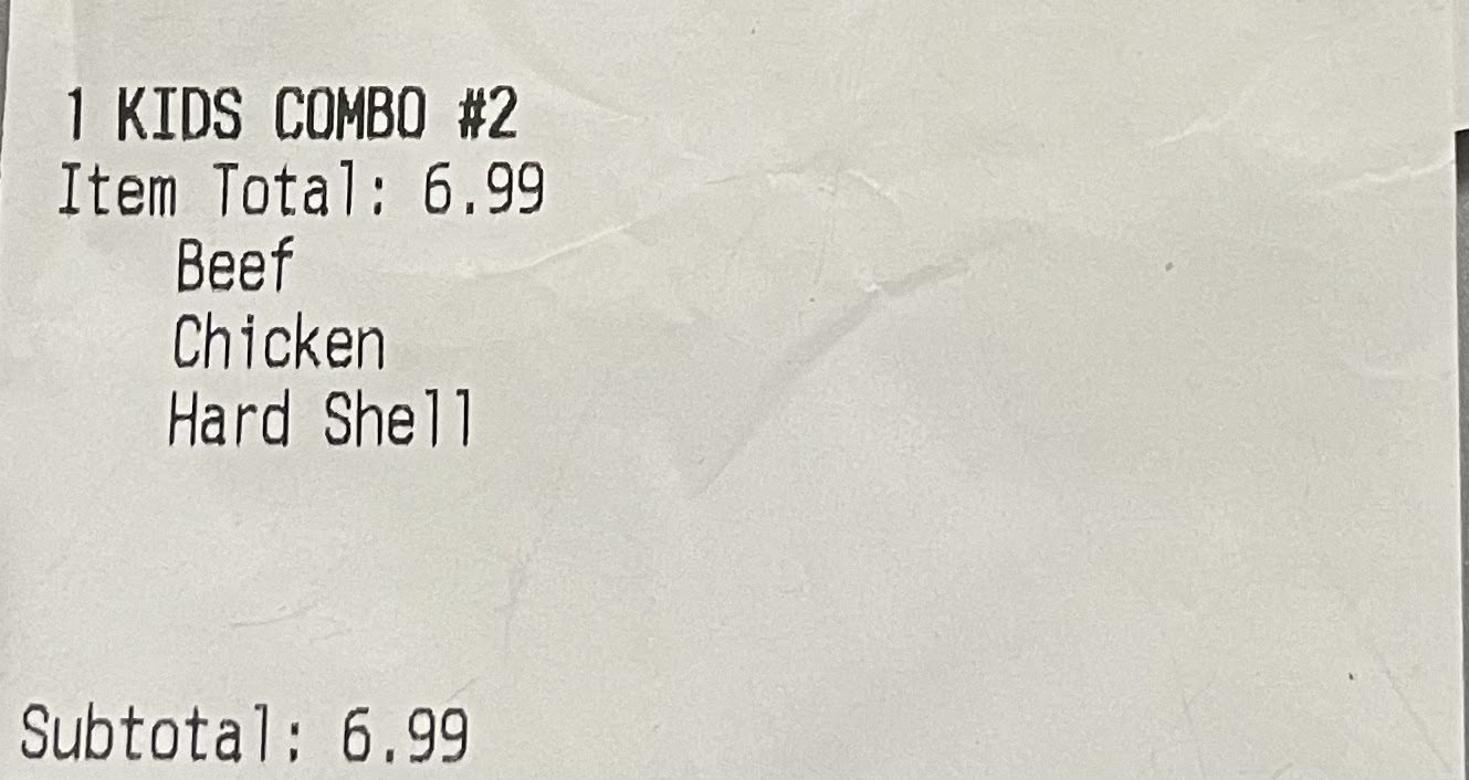 Read moreI ordered online and picked up my food - it seemed fairly simple: a kid's meal with a beef enchilada and a hard shell chicken taco. When I got home, it was reversed. I had a chicken enchilada and a beef taco. I called to inform them of the error (after I checked to make sure it wasn't my error) and they said I could come back and they would replace the meal. Fine, it happens. As I got ready to leave for the restaurant, they called me back to say that the order was prepared correctly and the error was not theirs. I told her what my online order said and she told me to read the ticket attached to my bag. It said: Kids Combo #2 Beef Chicken Hard Shell She said that the first item equals the protein for the taco and the second protein is for the enchilada. I asked then why is chicken above hard shell? Last I checked, enchiladas don't have hard shells. That is obviously the taco. Perhaps their staff wasn't properly trained to read their tickets. I asked if I could still come and have my meal replaced. She asked her manager and then reluctantly agreed. When I arrived, I was not greeted and they treated me like I was trying to get something for nothing. I paid for my child's meal and just wanted what I ordered and paid for. I tried to show the cashier my online order so they could see I wasn't trying to get them to pay for my error. She refused to look at it. They gave me my corrected meal. I checked it before I left and THEY PREPARED IT THE EXACT SAME WAY! There was a chicken enchilada and a beef taco. They really weren't happy with me when I showed them. It was prepared again and when the cashier handed it to me, I checked it, smiled and thanked her. She didn't return the smile and just handed it to me. She walked away without saying anything. No have a nice day, no apologies for making me come back to the restaurant, no apology for me having to wait for them to make it a third time, nothing. I certainly didn't feel like a valued customer. I am attaching photos of both my online order and the ticket that was attached to my bag. My family and I were frequent visitors to this restaurant. I truly don't want to patronize them anymore....