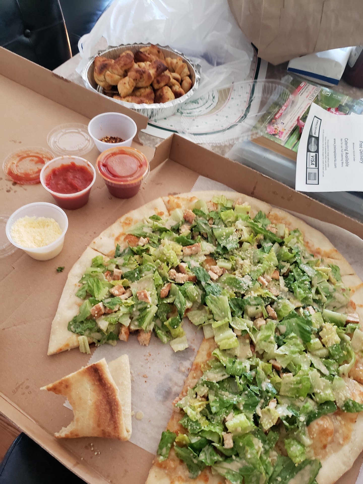 Over dinner I kept pondering our $4 dilemma. I went through the food we ordered in my head, and then it hit me. On the first visit I was charged for a garlic bread like it was a la carte when it actually came with my chicken parm dinner.