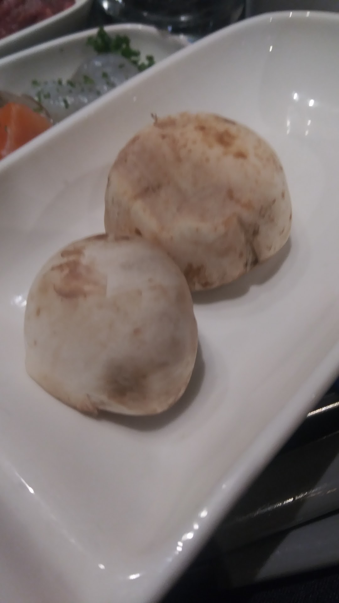 When the entrees arrived, there were some questions as to the freshness of the veggies that were brought to the table (grey broccoli, decaying mushroom caps - see pics,) and the red meats appeared to be small pieces of (cow, not steer) filet along with sirloin tip served in various marinades. These cuts of beef aren't an issue in the slightest if properly cut to take full advantage of the grain of the meat, but in our case the house butcher prepared pieces with tendon intact, chunks cut with the grain (makes meat tougher than it needed to be) and suitable for making a nice stew, not deserving of a fast swim in a fondue pot.