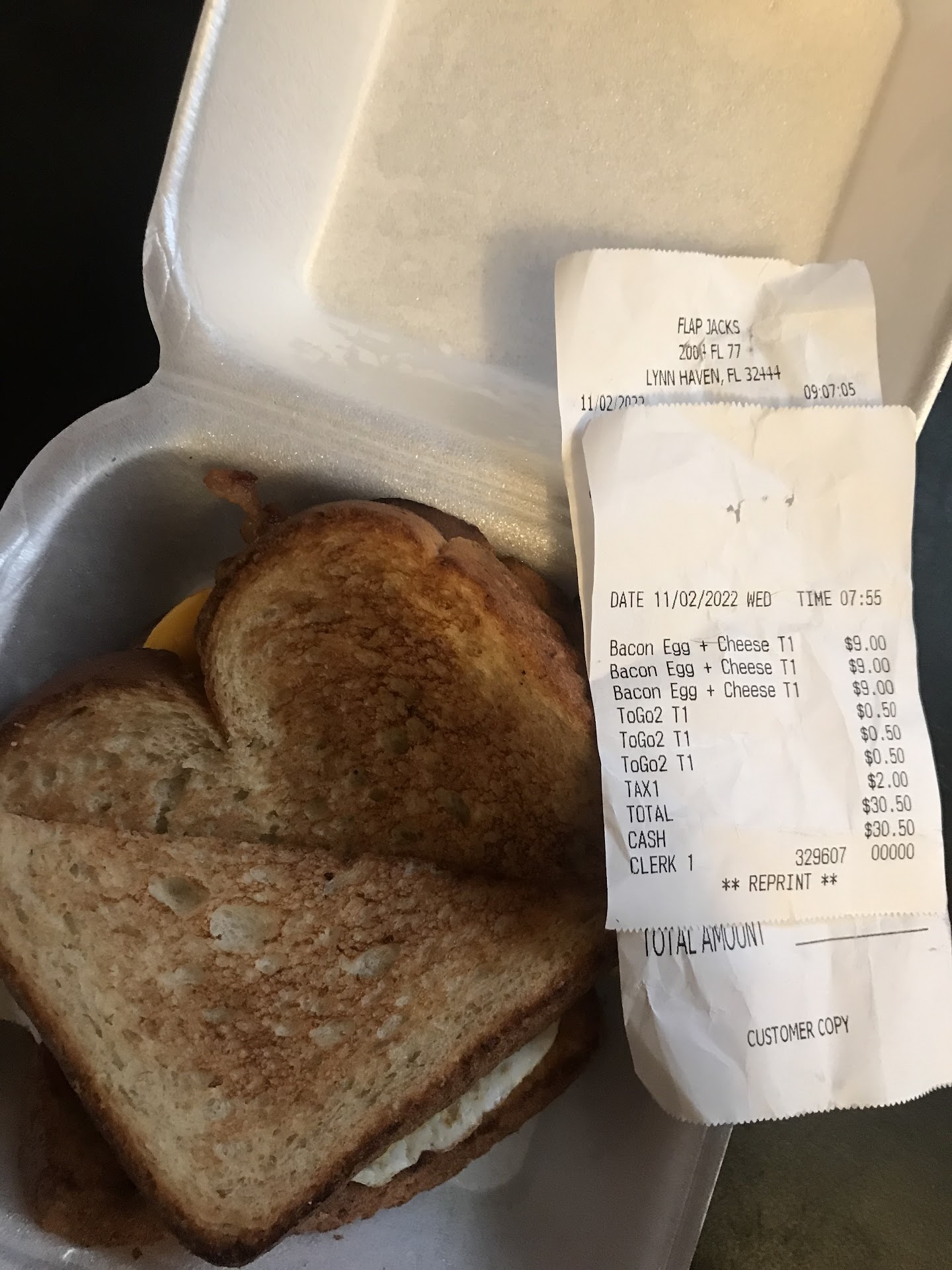 Today I went to Flap Jacks, first time ever eating there, ordering 3 Bacon, egg, cheese, on wheat toast sandwiches, only nothing else. Bill came to $30.50, at check out. I asked for what, was told prices are going up more, things are expensive. Basically, $10.00 for 1 sandwich, when at the door it has a $9.75 price for, flap jack pancakes, eggs, and bacon. I am ashame of even taking the sandwiches at this point. The other two individuals a well known business that is established in Lynn Haven was very dissappointed in this. We will never return there and not recommend to anyone, and sing this to the top of my lungs of the services...
