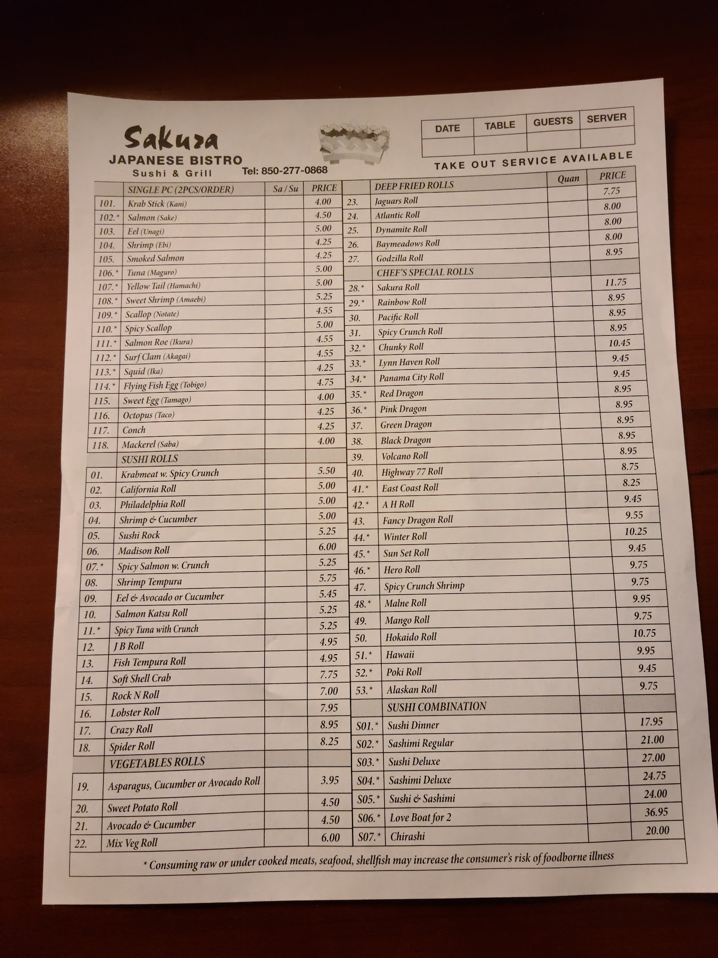 This was my first time trying Sakura Sushi & Grill, at my granddaughter's request and she was right! It's a small restaurant, however, don't be deceived it was packed and with good reason! The food is delicious! Even though they were very busy the staff was friendly, professional and patient. We placed a to-go order and decided to wait in the car. They do have outdoor seating but they were all wet due to the rain, so we waited in the car. I had hibachi chicken and my granddaughter had the hibachi shrimp. My order came with white or fried rice, lo mein noodles and a very generous serving of chicken and vegetables in a delicious hibachi sauce and I got the house soup and salad. I also wanted to try the sushi so I ordered a California roll. I was able to finish the soup and salad. The remainder of my California roll after my granddaughter bravely decided she needed to perform the "Is it poisoned test" and about a quarter of my hibachi chicken! So, you know what I'm having for lunch tomorrow! đ Everything was so delicious and I will definitely be returning for lunch or dinner very soon! Sakura Sushi & Grill is definitely a dining experience that should...
