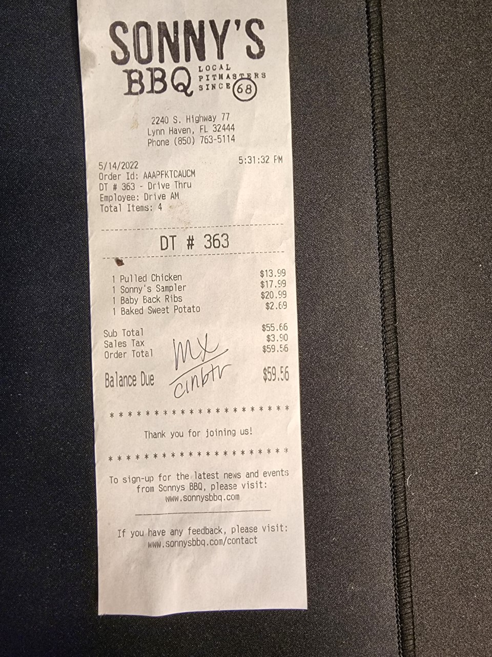 Anyway, we like Sonny's BBQ. It's a Florida classic and will always be part of future trips to Florida. This Lynn Haven location had me frustrated a bit, but it worked out in the end. We'll probably order our food to go next time because of our...