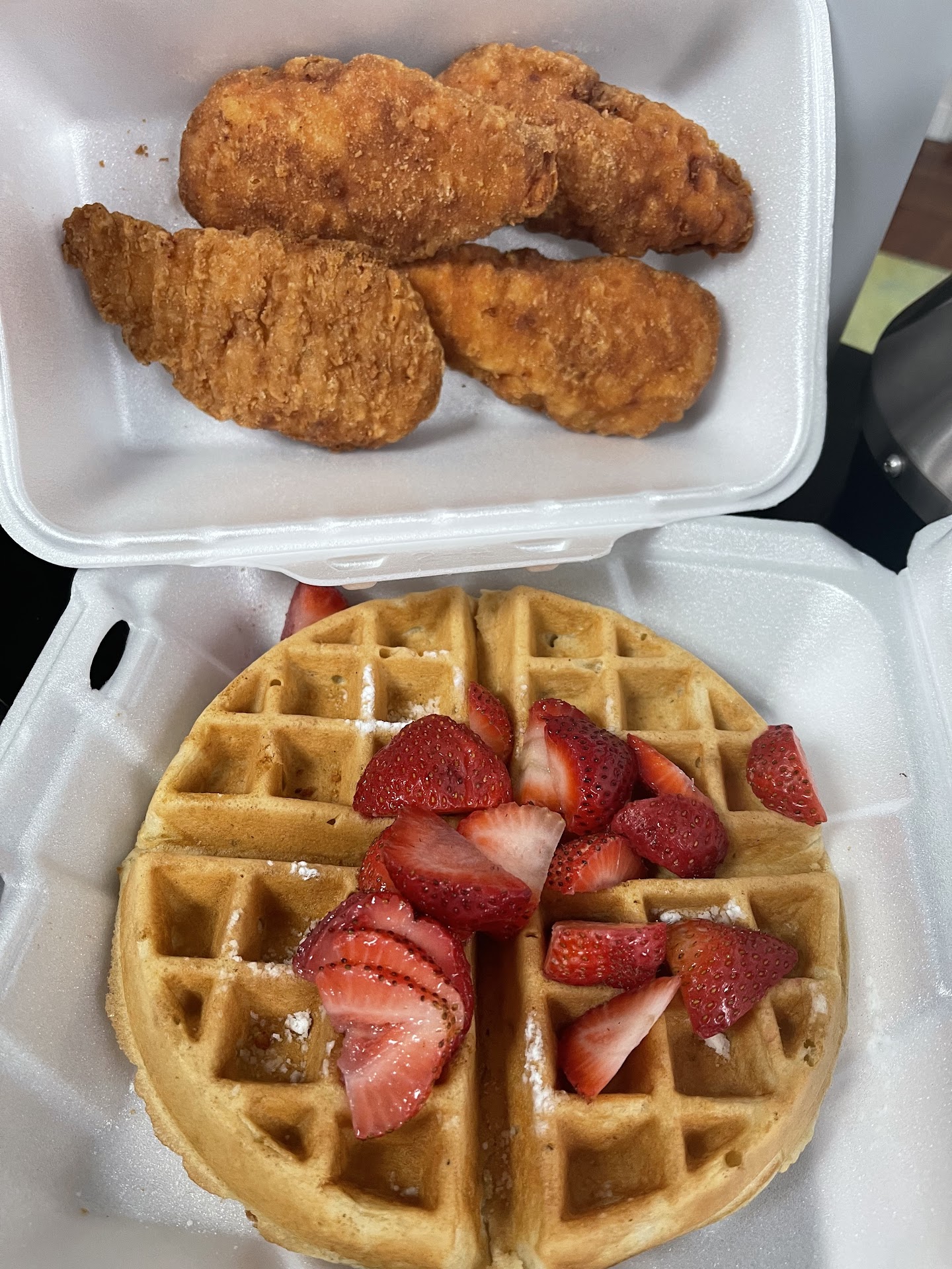 I have never posted a negative review anywhere, but I have to here. We ordered the chicken and waffles, side of sausages, and an omelette. For the waffle I asked for blueberries on top and got strawberries. Mistakes happen, that’s not a huge deal but they were the worst strawberries I’ve ever had. Tasted a bit like chemicals but mostly tasted like they were going bad. The waffle itself was inoffensive, tasted like it was from a store mix. Rubbery but we did get takeout so could be from that. The chicken for what was supposed to be chicken and waffles was just chicken fingers. Definitely frozen chicken fingers. The side of sausages was $4 for 3 tiny frozen sausages. They’re the same ones I have in my freezer. $4 for good sausages is totally reasonable, but charging $4 for 3 tiny frozen sausages is insane. For the omelette, it was cooked fine and it was the Boston omelette so filled with multiple things but was bland and very clear that a good amount of it was previously frozen. Home fries were tasteless. Even the butter on the toast was weird tasting. Giving it two stars instead of one only because most of it was edible. The strawberries were the only thing that we really weren’t able to eat, worst...