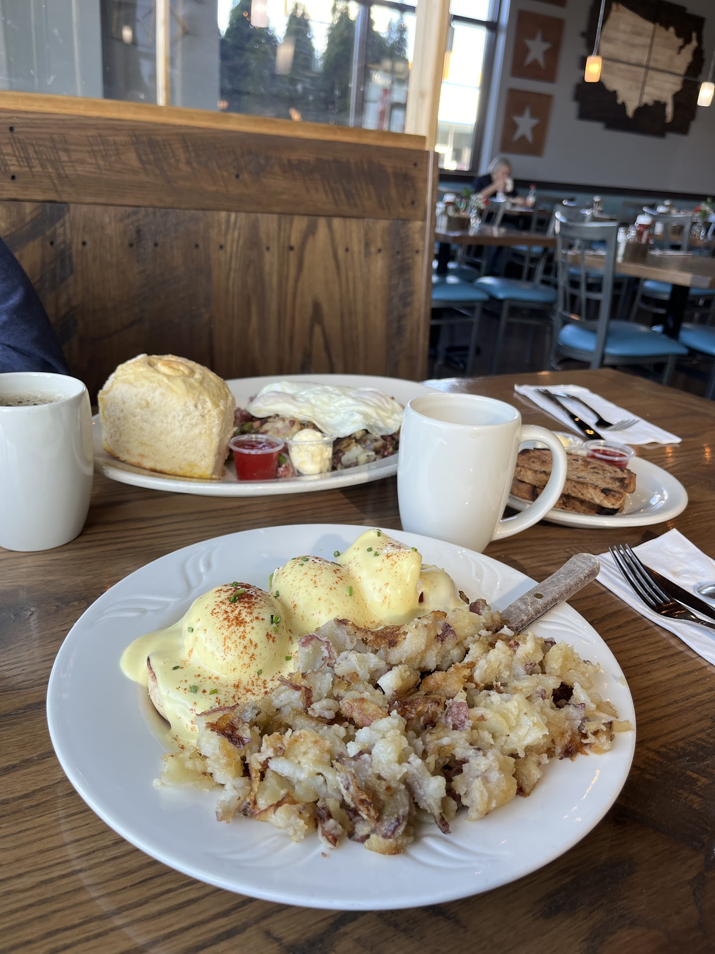 Y’all. Everything was piping hot!! What magic is this!?! Potatoes perfectly crispy and melty. The poached eggs were expertly made and still jammy and creamy inside! Dream come true!! Scrambled eggs were so fluffy and moist! Chicken fried steak was so good and tender. The pork belly was crispy and still fork tender, like a roast. WOW! The biscuits were the size of softballs and still hot and moist. They were amazing even on their own.