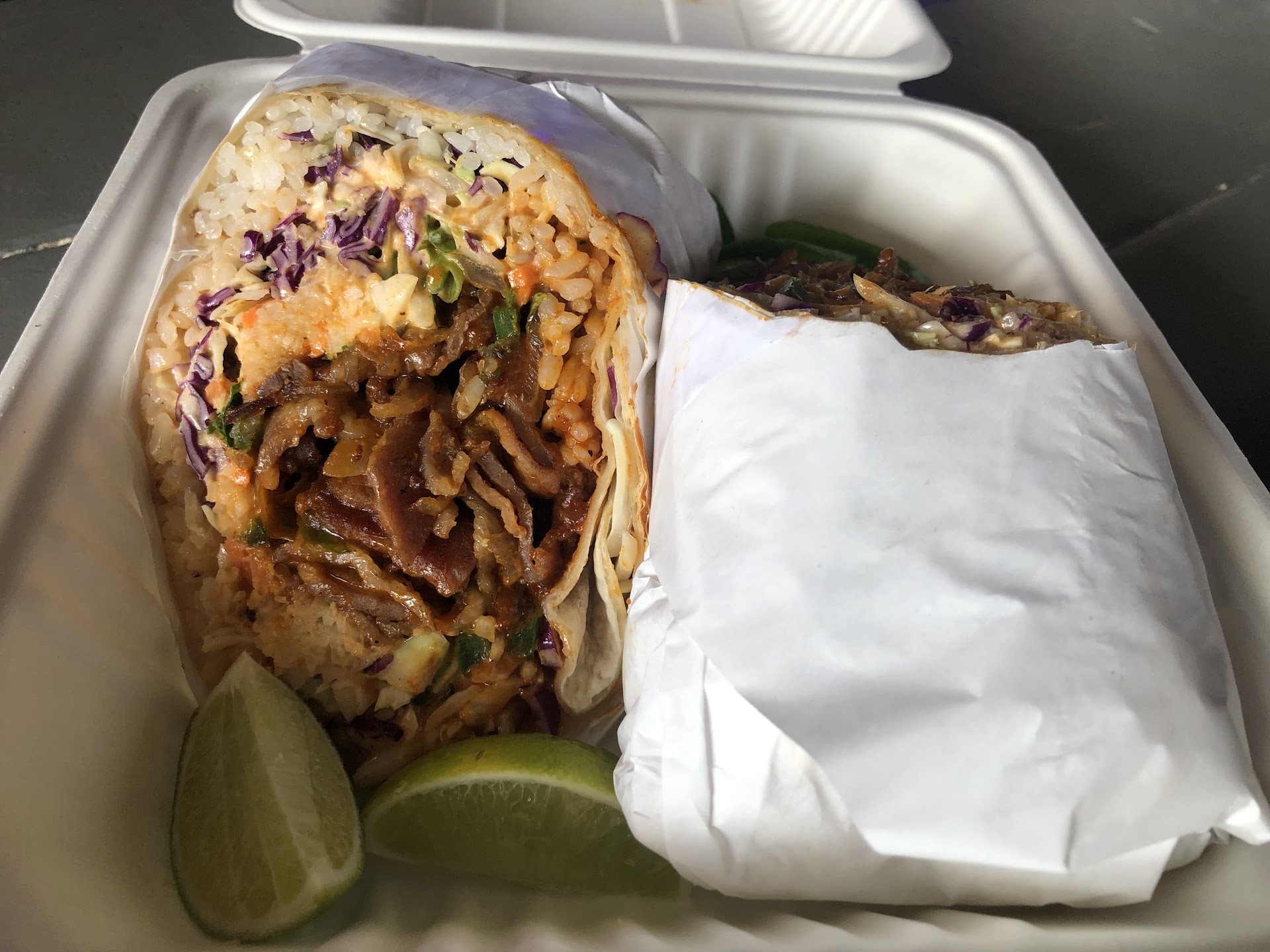 I stopped by here on a summer afternoon to grab some lunch. It's located near the Hmart plaza so there is plenty of parking nearby. The restaurant itself is small and there's no bathroom available either. There are mostly picnic style benches inside for seating, otherwise takeout is your best option. You self-order on two tablets by the door. They will call your number when your order is ready. We ordered the Locosoba and Bulgorrito. Both were very thick and extremely packed burritos. It was full to the brim. It almost makes it hard to hold the burrito together so some utensils would be helpful. The Locosoba was filled with yakisoba noodles, korean BBQ beef, and veggies. Even though it had a combination of different flavors, I was still able to make out the individual ingredients and it was not too spicy. It's definitely more on the sweet side if anything because of the noodles. The Bulgorrito was also the same and very packed but more with beef bulgogi. I was still able to make out the individual ingredients. The burritos came with sides of lime slices and green chili pepper to help cleanse the palate. Overall both burritos were extremely filling and more than enough to satisfy even the hungriest.