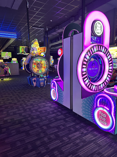 Gf and I were the first of a party of six to arrive at D+B at 6:30 pm on a Saturday. (The Second to last Saturday before Christmas which was in a week.) As we walked in we noticed how loud it was. The music was expected to be loud but we literally had to shout in order to talk to the employee that stands just inside the door to provide information. We learned a few things from this employee. 1. There was going to be a long wait for a table at the restaurant, because there was a 200 person party reservation at 7pm. They would not be seating us because we were a party of 6 and they were only seating parties of 4. She said we could "try" to get on the list to wait, but they probably wouldn't seat us. She did tell us that there was open seating in any of the white chairs at the bar. She was giving a big, just come back on another night vibe. She explained to us how to get game cards from the kiosks that were in the lobby. We decided to give getting a table a shot. Made our way towards the bar and the restaurant expecting packed tables and a line of people to be seated. Quite the opposite, there were giant booths empty, the bar I would say had about 50 to 60 seats at different high top tables available, some of those tables had been seated. We looked towards the bar and saw a few white chairs available. Behind the bar was the main seating area mostly empty. We were confused. We talked to the restaurant hostess and got the same story. She too was very blah and really didn't encourage us to go and play games or drink in the bar while we wait. We had to ask if there was a list to be put on to wait. It was just all so unwelcoming. So, we got put on the list and headed to the bar to wait 2 hours for the text saying our table was ready. At the bar, things got a lot better as far as the service. The bartenders were busy but attentive and helpful and nice! We ordered a few drinks and food. They were both really good. I would say about 35 to 45 mins had passed and we got a text saying our table was ready. No where near 2 hours. I went down to the hostess station again and was told to follow the employee guiding me to our table. She literally took off up this ramp into the bar, left me behind a big group of people that she had squeezed through and then once I caught up she pointed at a table for 4 from about 30 ft. away and said, there is your table over there. I was like...okay, that's for 4 people not 6. She looked aggravated and just pointed to a bigger table and just pointed at it said you can have that one. Turned around and walked away. So meh. We all ordered food and more drinks. Service was good and came from the kitchen very quick and was all tasty. Our food and drink bill was around $160 before tip. We could conveniently order game cards from our server. We opted for 2 400 credit cards for $60 dollars each. The server then added the cards to the food bill at which point it asked us to leave a tip based on the card purchase and food combined. Which was $277 dollars. So a 20% tip was $55 bucks. Total bill for the night $332. BEWAREOF THIS! I hate this tactic so much. Your tip is going to be more because of the cards. Tip on the food and service but not the cards. D+B should do better by not being sneaky about this. The rest of the evening was fun playing the games. All the games let you earn tickets that you can save and collect and redeem for items. The nicer the items the more tickets you need. I got D+B juggling balls, a LED light cup, a web cam blocker clip and a laffy taffy for $60 bucks basically. I thought the offering of items they had were pretty good, but you are going to have to spend a lot of money to get the better stuff. I hit the restroom on the way out and it was clean and functioning. Overall it was a fun night. I just think D+B should do some customer service training with their younger employees who are first to greet customers and be more welcoming and get people to hang out and wait. Would have been a 4-5 star visit had we had felt less pushed away in the beginning....