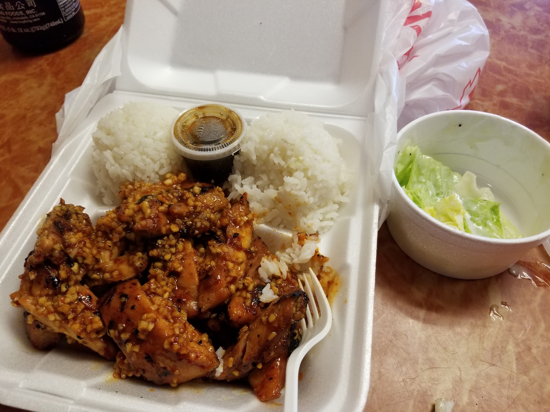 Read moreLiterally paid 45$ for a beef yakisoba, chicken teriyaki/egg roll combo and an order of gyoza. Chicken teriyaki was plain grilled chicken thighs and dry white rice. I specifically HAD to order teriyaki sauce on the side. I get the salad isn't 'really' much, but lettuce and already over poured dressing was alot. Please, please, go to Safeway and get a bag of green salad w/ carrots and cabbage in it for 2$. I don't have high expectations of teriyaki really, it's hard to mess up. But, I'm not going back again. Gave them 2 stars because the chicken was grilled well. Js, there's alot of other options. And the middle aged guy behind the counter was a bit much. Asked for the chili oil, saw the chili oil... and he gave...
