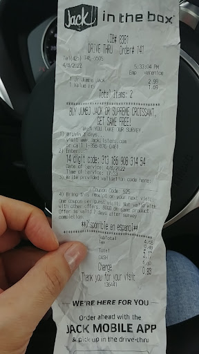 Read moreSuper disappointed with this location. Normally I love JITB and their offerings; however, this particular location is terrible. Every time we've gone to get food here there is a problem with the order. Either the speaker is too quiet or the person taking the order doesn't really know what they're doing or they just don't care. In addition to ordering issues, whoever they have in charge of inventory and making sure they don't run out of ingredients and such is doing a terrible job.