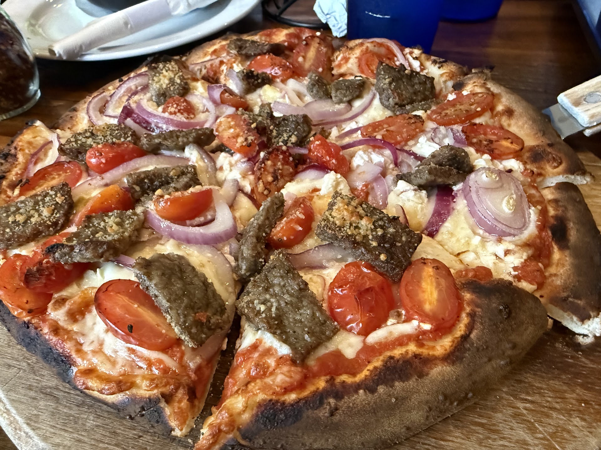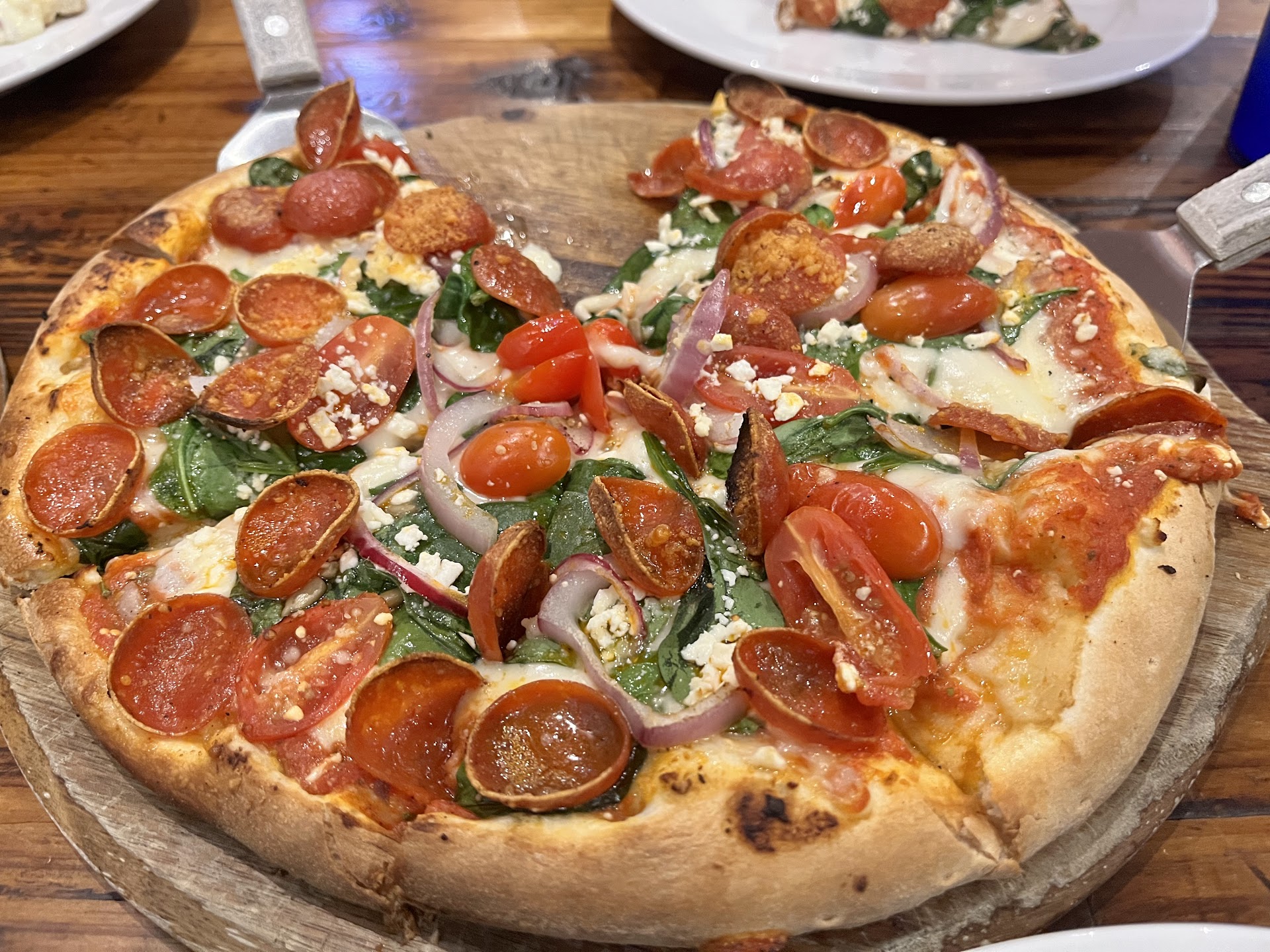 PIZZA commentary: Dough is made by the cottage bakery next-door, which resulted in a perfect flavor and texture in my opinion. The sauce is flavorful, but not overly salty or garlicky. It has a robust and fresh tomato/herb quality. Cheese is high end and the ones selected makes for an interesting and evenly melted finish. However they have dialed in the temp and time for cooking 2 weeks later, it's on point! Cooked throughout and because of the cooking method, it delivers a perfect wood oven crisp/flavor.