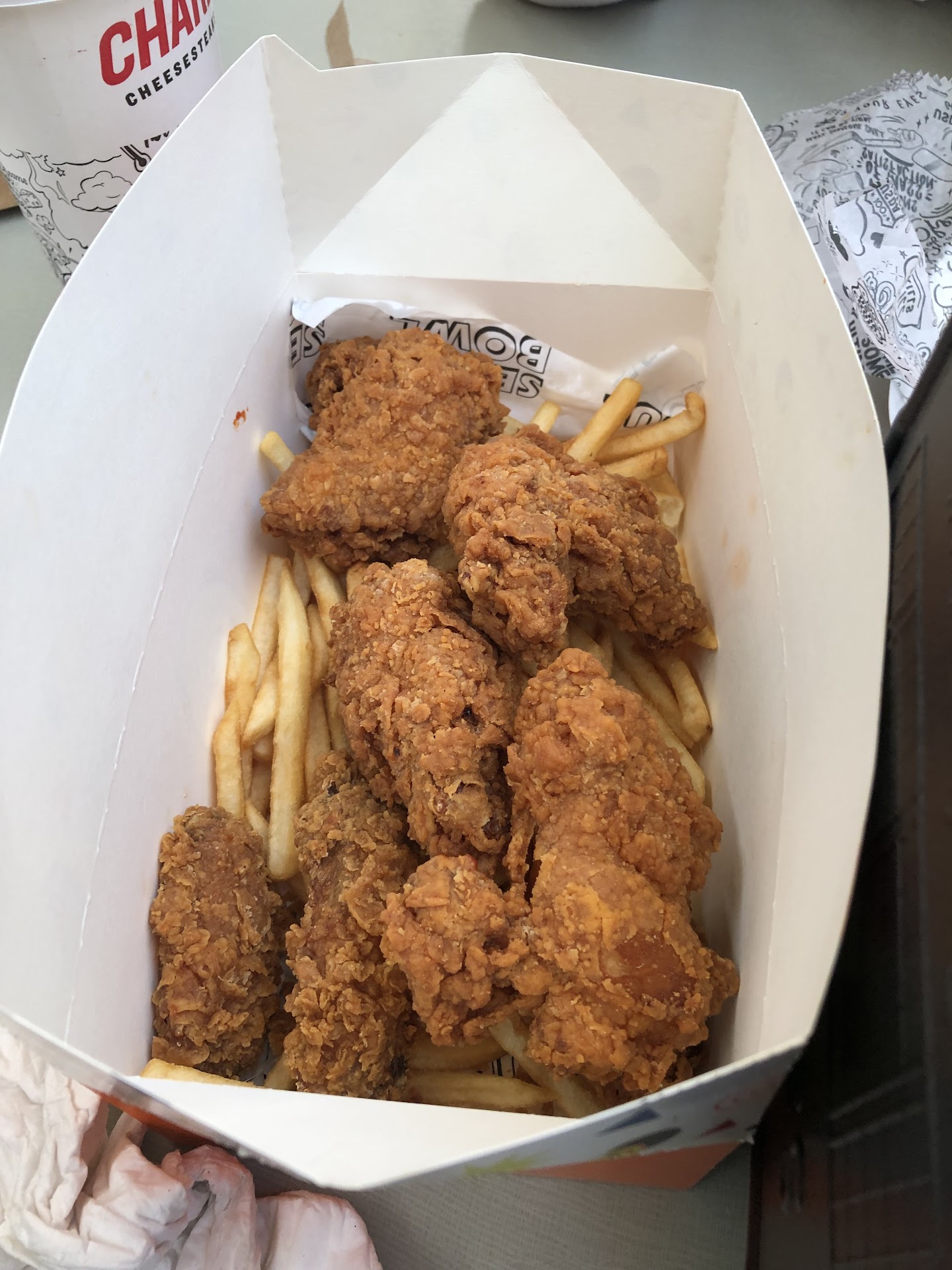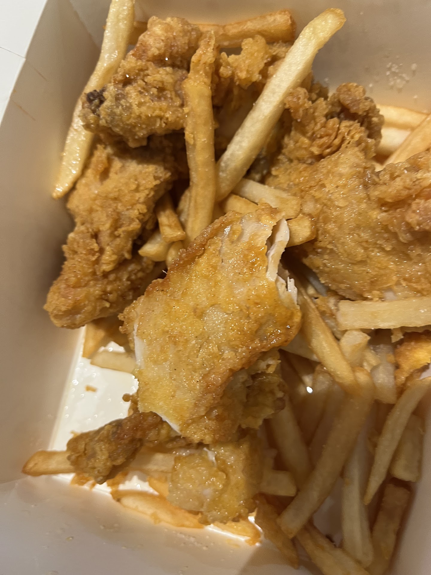 Chicken wings were sketchy at best. Didn't eat them all, and the fresh are average. The chicken strips are massive, so you get your money's...