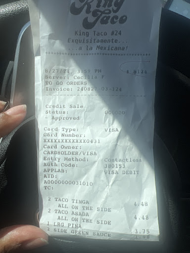 Read more“Love that King Taco Removed my review from last year. But here it is again.“ Always Ensure that you check your Food before departing the counter. If you love meatless Burritos with Only beans and Rice then you’ve come to the right place. I’m only reposting this because it happened to us again this time at the Fontana location. The Founder would Turn Over his Grave if he Witnessed what his Legacy has Now Become. It’s sad cause I Actually Knew and worked Closely with King Taco Himself and his Family Personally. (But I left the Company back in 2017 and started my own Business). I worked and monitored with the Expansion and opening of various locations through out SoCal. But I would have NEVER! Allowed a Needle sized Burrito to leave my Kitchens like this. Slowly but surely it started going downhill (Probably after his passing). Rest in Peace King. I’m Happy that you at least left this world with the mindset and thought that you left your Permanent Mark on...