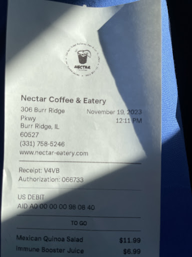 Read moreI was in town for a conference and visited the Nectar Coffee & Eatery for breakfast one morning. This is a very nice little cafe. It has a great atmosphere and is nicely decorated presenting a relaxed environment for just about any kind of interaction. I ordered the peanut butter smoothie. The ingredients are milk, peanut butter and, banana. Only three ingredients and it was very excellent. A friend of mine ordered a mocha and a muffin and enjoyed both of them. This is a great place to meet friends, come in to relax after a hard day, or start your...