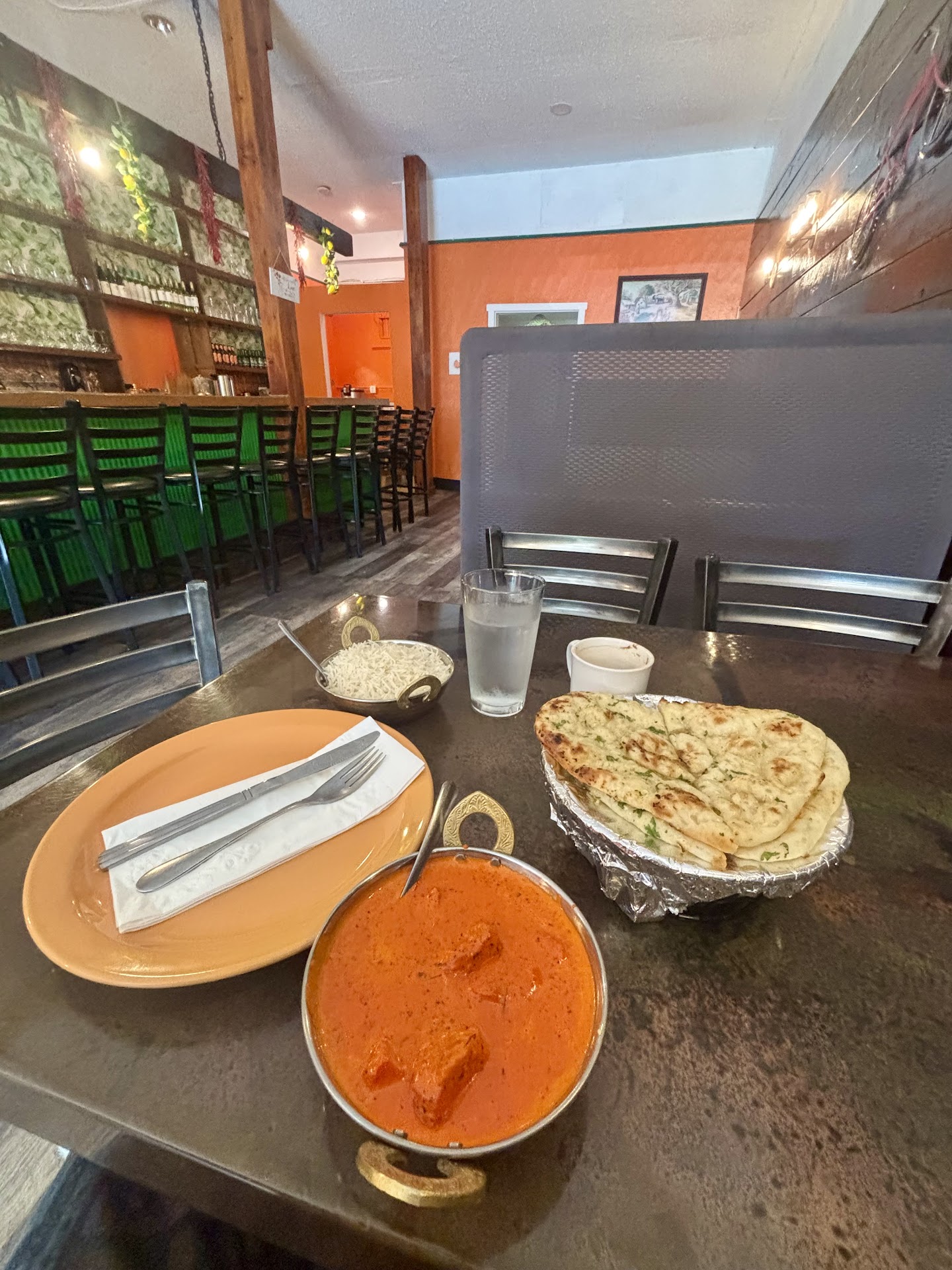 The ambiance was lovely and had a serene calm environment to it. I ordered vegetable pakoras, garlic naan and a lamb Korma which all came out within ten minutes of ordering.